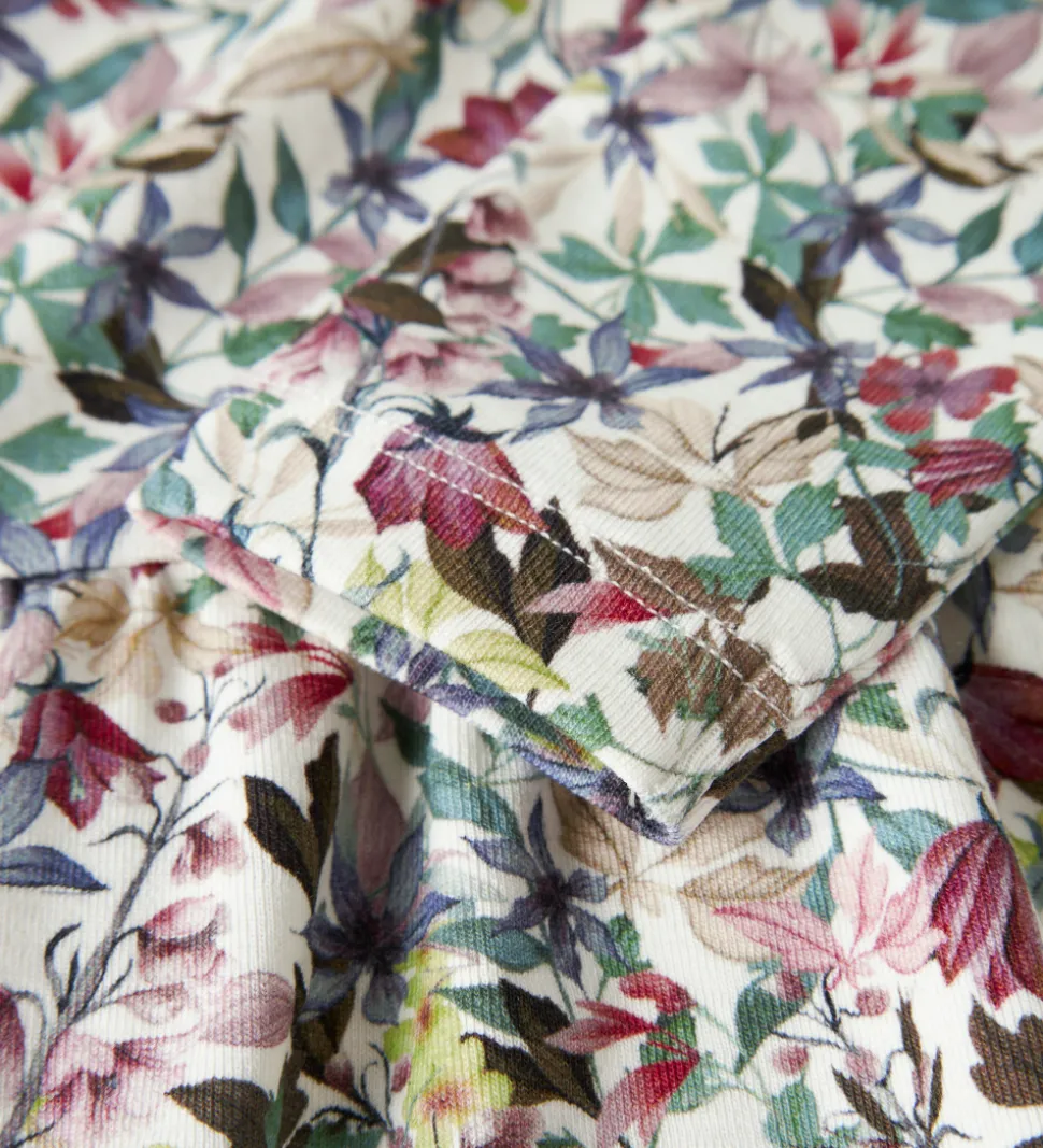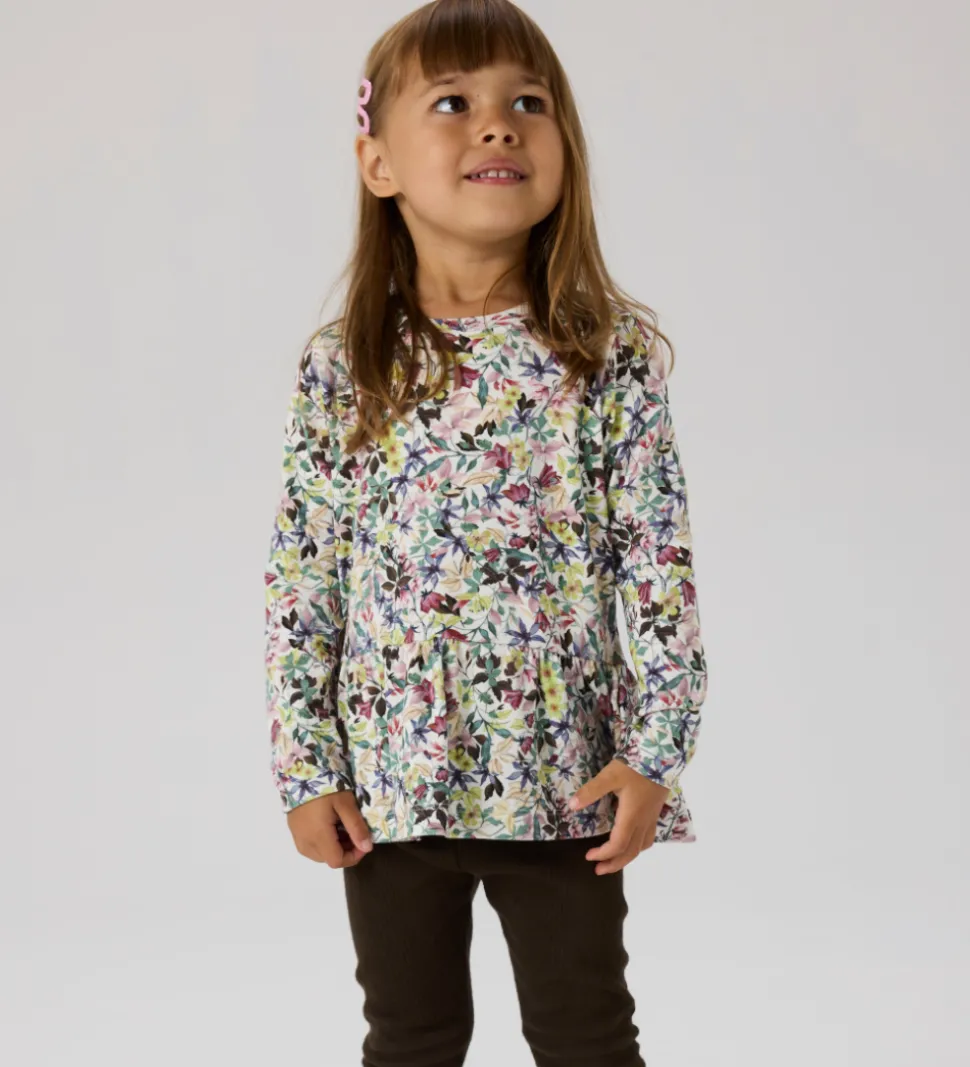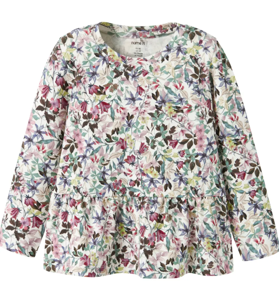 Smuk Name It bluse i hvid med farverigt blomstermønster. Blusen har en rund halsudskæring og lange ærmer. Den er skåret ved taljen, hvor blusen har rynker og ekstra vidde.