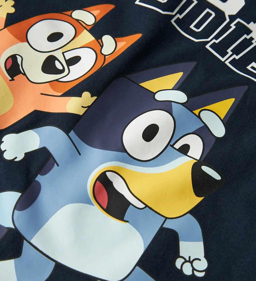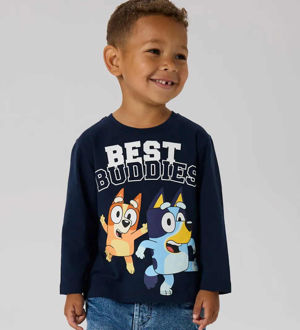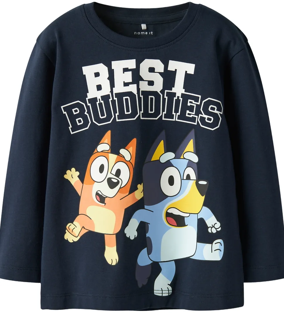Dejlig Name It bluse med lange ærmer i en mørkeblå farve. Fronten prydes af et Bluey-print med teksten “Best Buddies”. Blusen har en rund halsudskæring, der komplementerer det afslappede look. Name It blusen er et godt valg til garderoben med sit karakteristiske design.