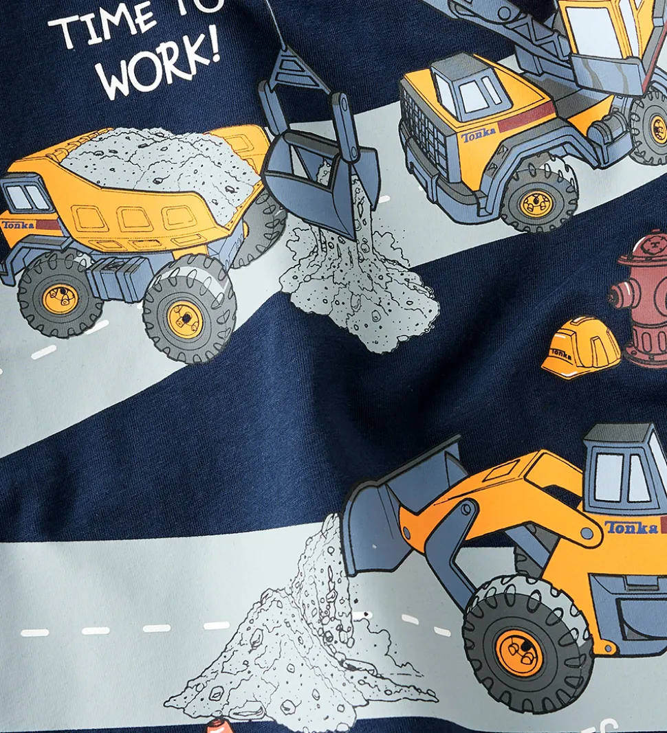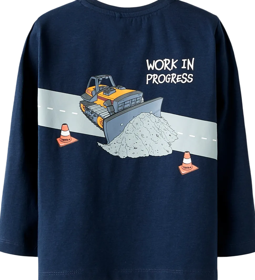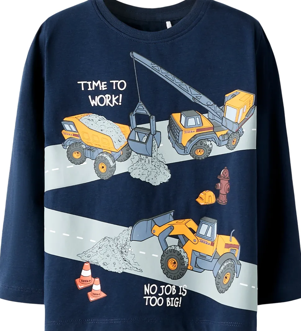 Smart Name It bluse med lange ærmer i navyblå. Blusen har et detaljeret print med byggeplads-motiv samt tekstprint på for- og bagside. Motivet inkluderer lastbiler og kraner. Blusen har en rund halsudskæring med en smal ribkant.