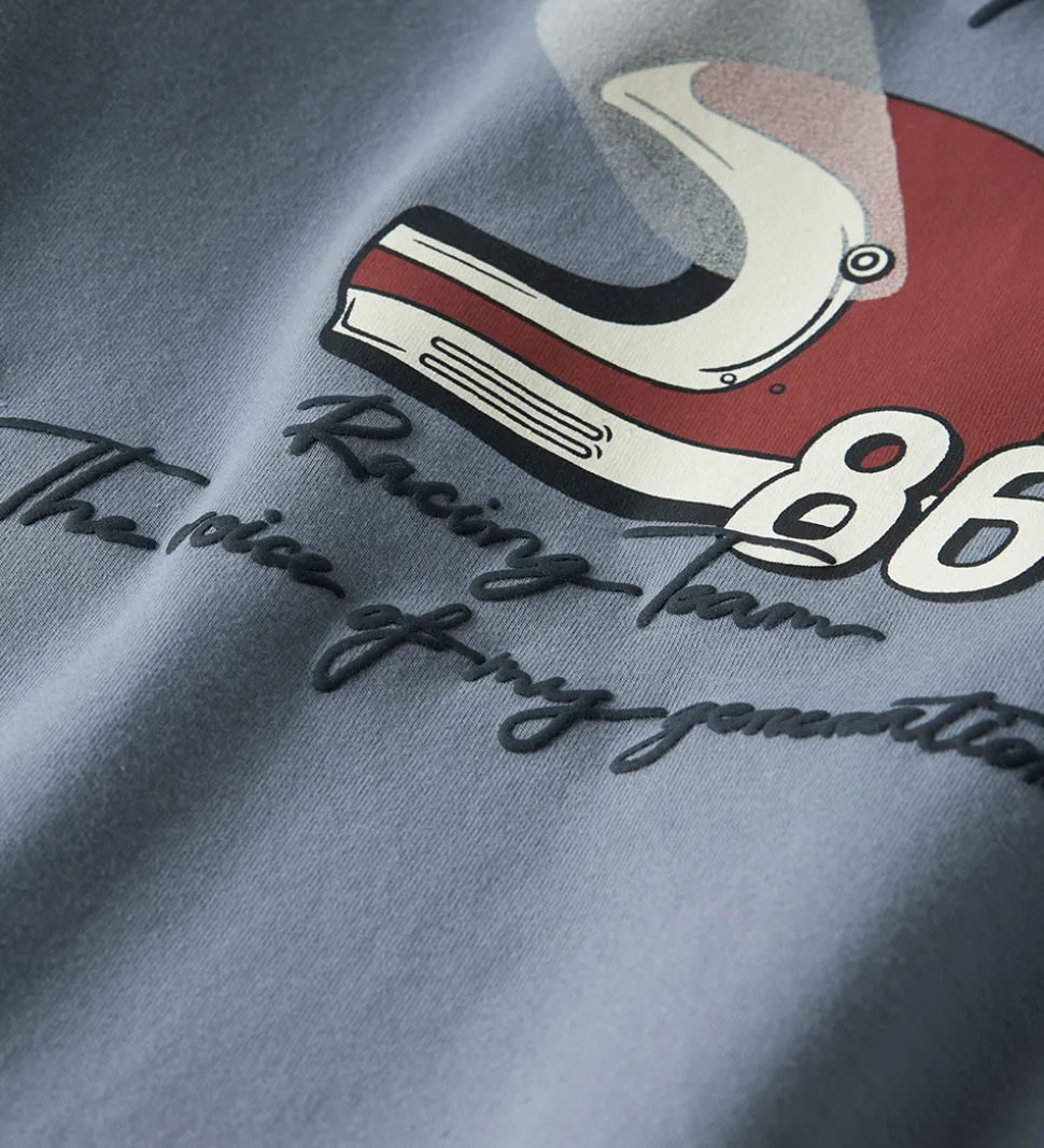 Stilfuld Name It bluse i en afdæmpet blå nuance med navyblåt tekstprint på brystet og på ryggen. På ryggen er der desuden et print af en rød hjem og tallet “86”. Blusen har en rund halsudskæring med en smal ribkant og lange ærmer.