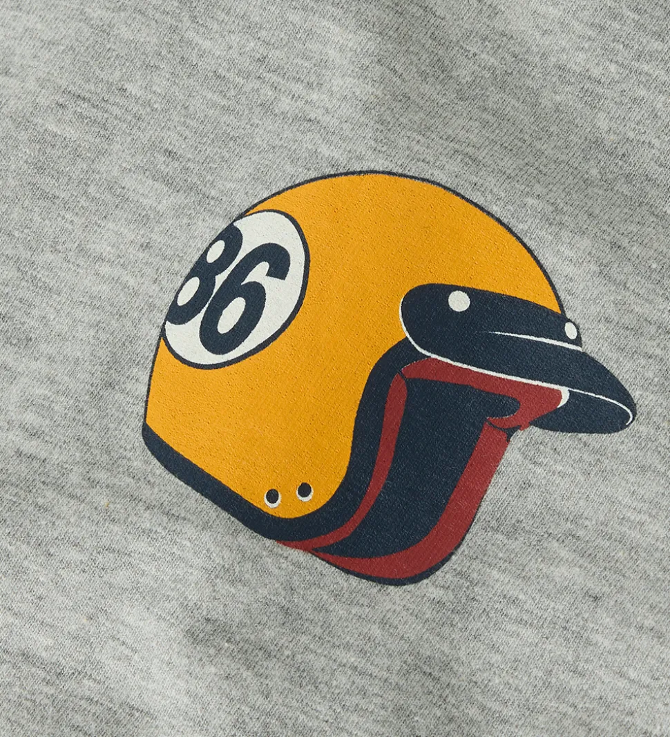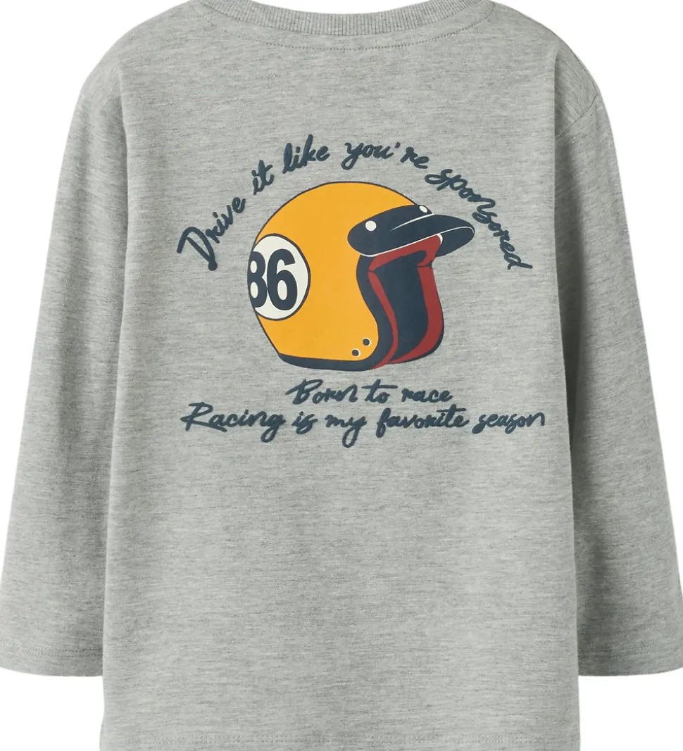 Smart Name It bluse i gråmeleret med et print af en gul hjelm på venstre bryst samt på ryggen. På ryggen er der desuden navyblåt tekstprint. Blusen har en rund halsudskæring med en smal ribkant og lange ærmer.