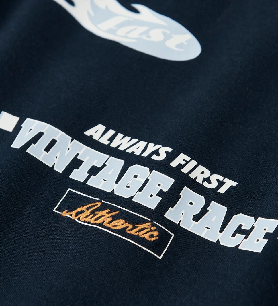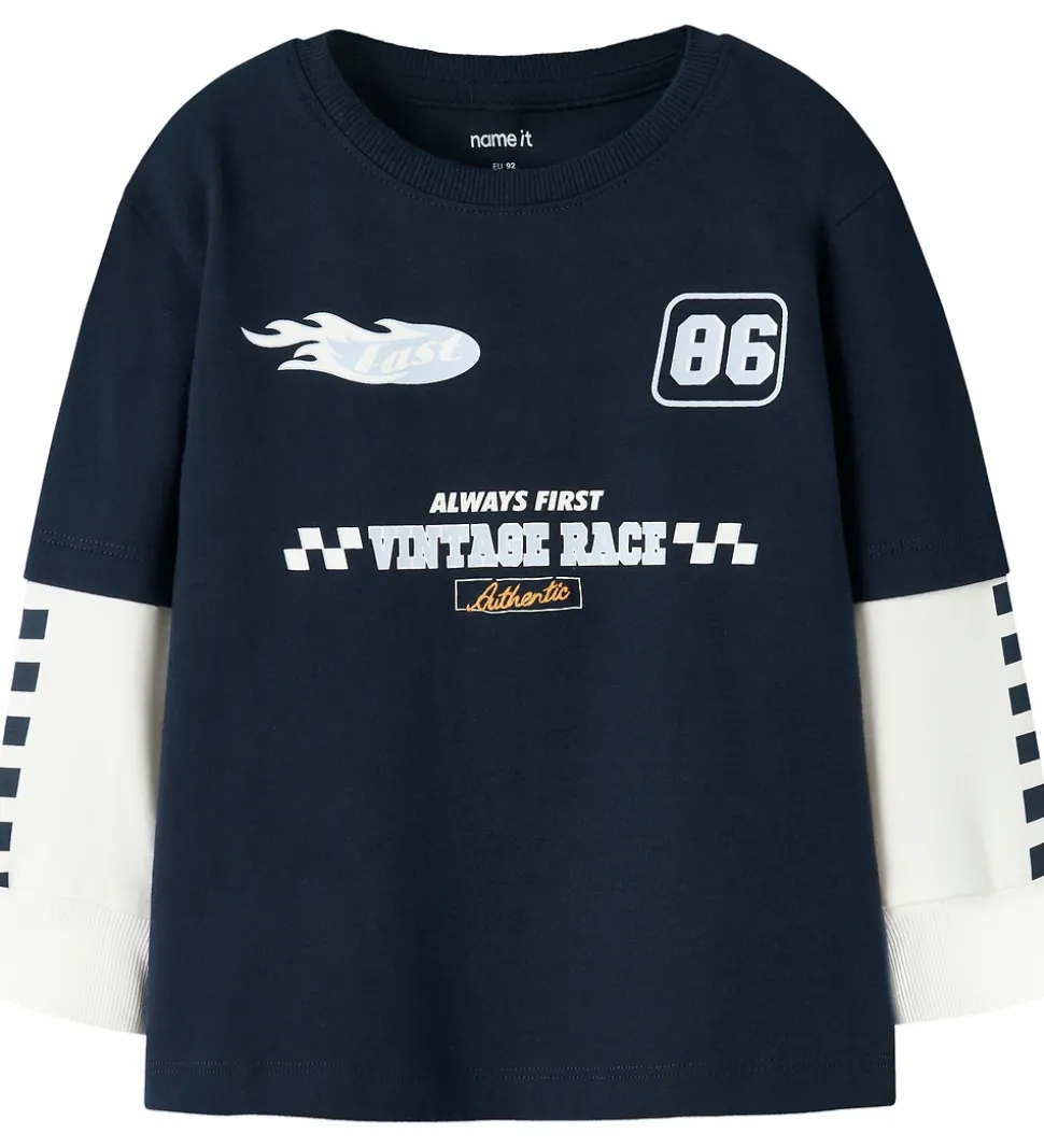 Sej Name It bluse i navyblå med hvide ærmer, så det ligner at man har en langærmet indenunder en t-shirt. På forsiden ses teksten “Vintage Race” og nummeret “86”. Name It blusen har en rund halsudskæring, der fuldender det moderne udtryk.