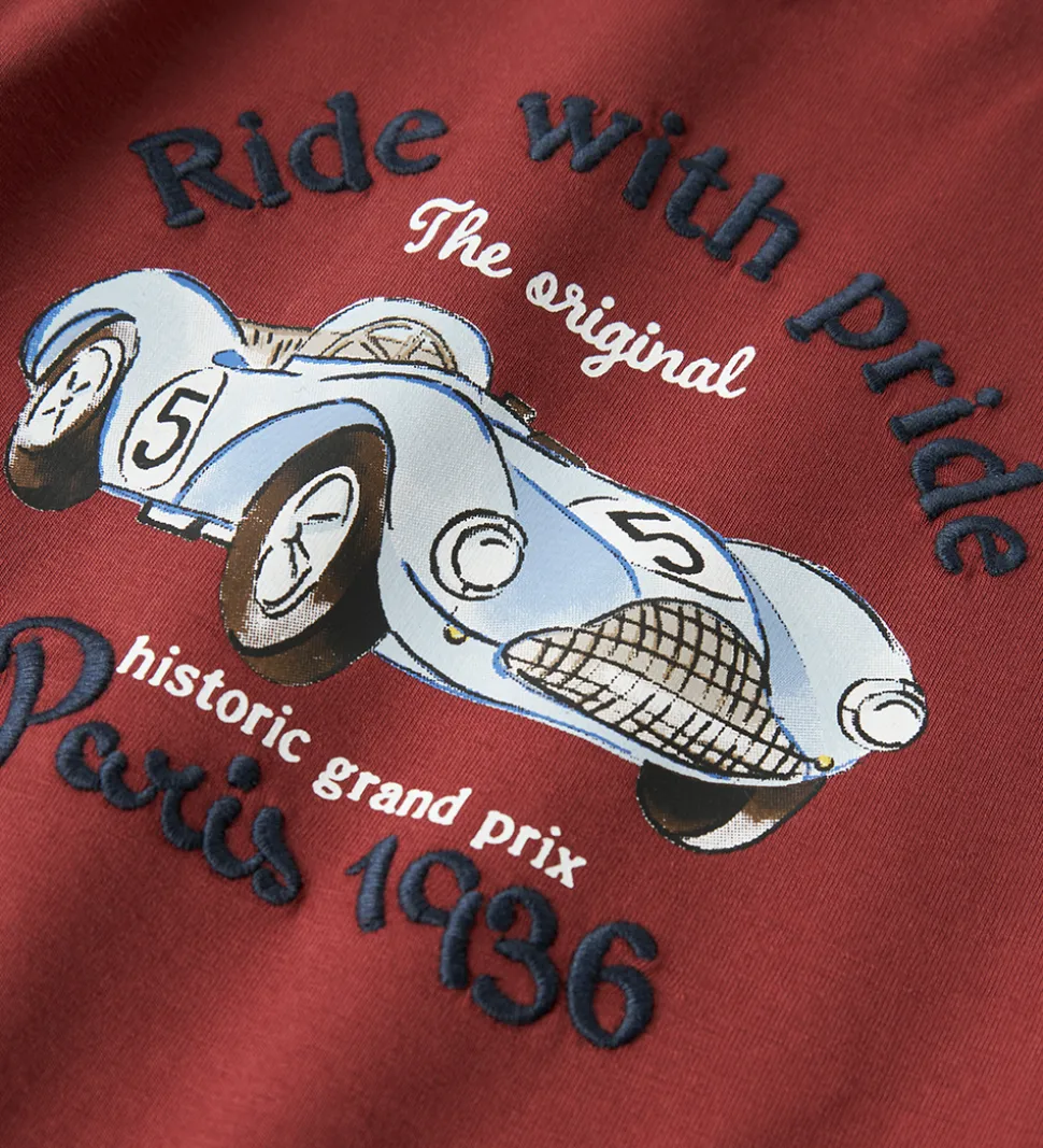 Stilfuld Name It bluse i en dyb rød nuance med lange ærmer. Blusen har et print på fronten af en racerbil og teksten “Ride with pride”, “The original historic grand prix Paris 1936”. Name It blusen har en rund halsudskæring, som giver et simpelt og tidløst udtryk.
