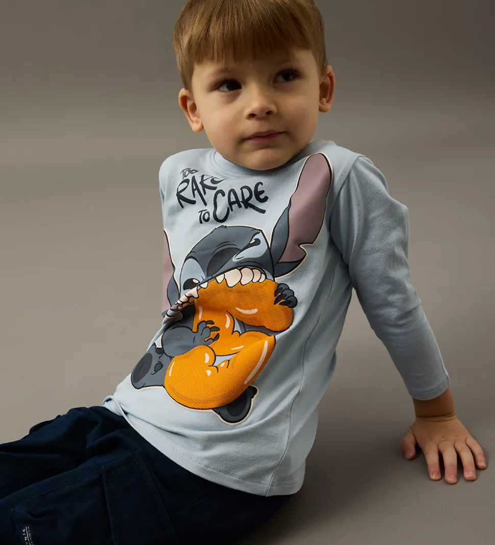Charmerende Name It bluse med lange ærmer i en lys blå nuance. Blusen er dekoreret med et stort print af Disney-figuren Stitch og teksten “Too Rare to Care”. Blusen har en rund halsudskæring med en smal ribkant.