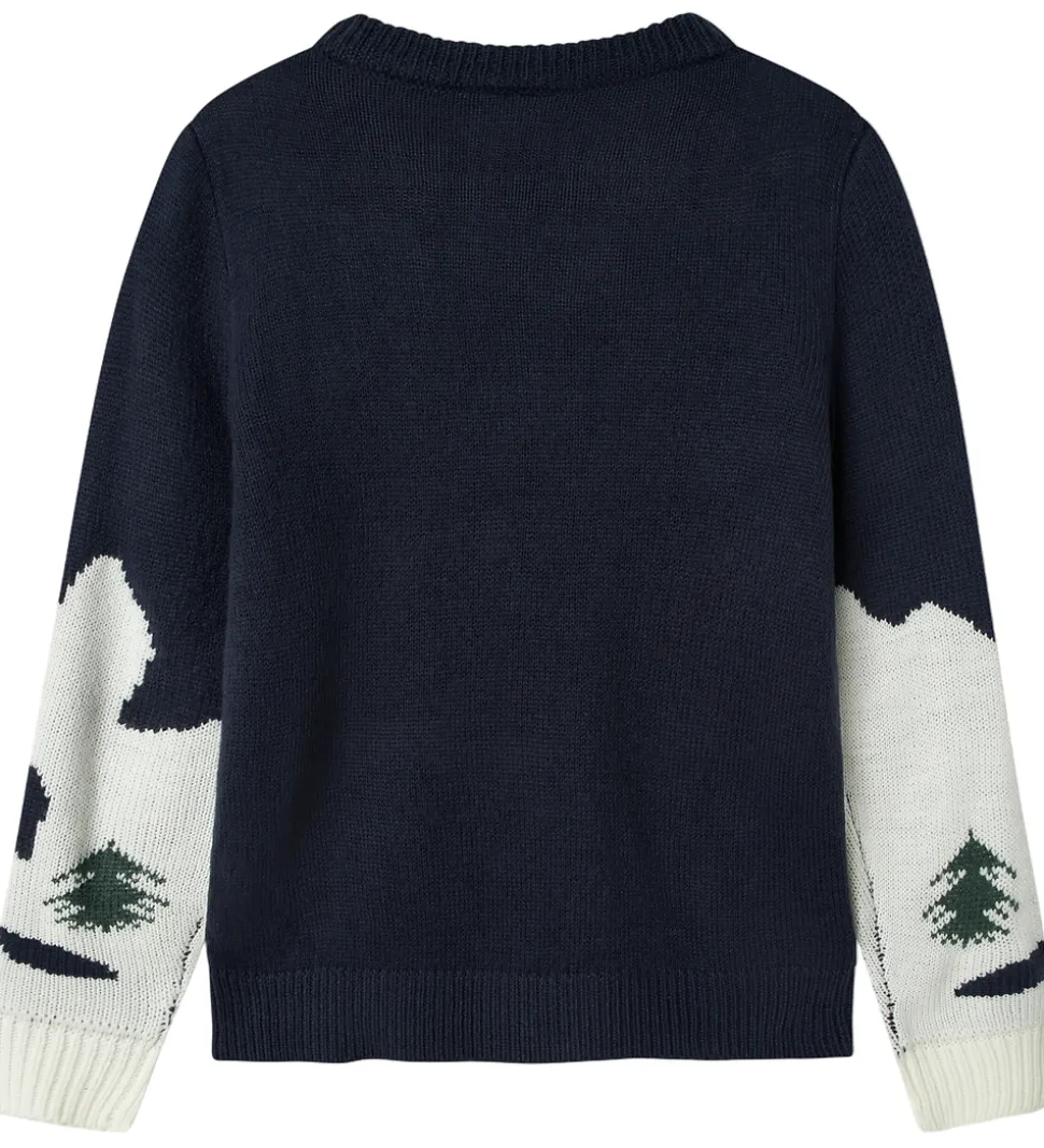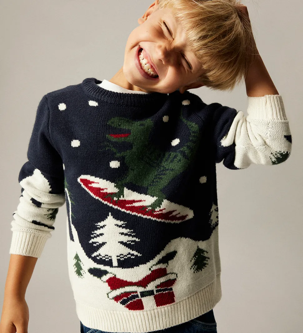 Sjov Name It bluse i navyblå med et stort snelandskab på fronten og en dinosaur på snowboard. Blusen har en strikket struktur med lange ærmer og ribkanter.