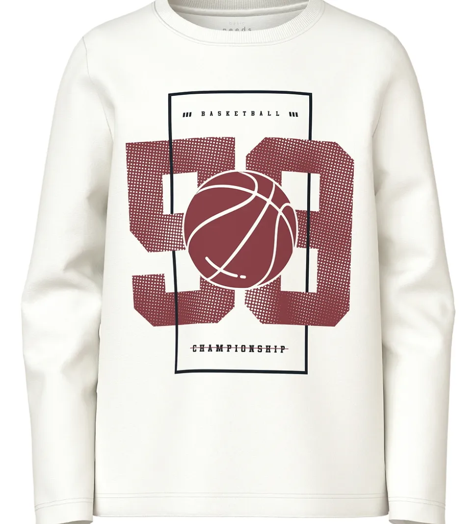 Sporty Name It bluser i en pakke med to forskellige designs. Den ene bluse er i hvid med et stort print af tallet “98” og en basketball. Den anden bluse er beige med et print af en ishockeyspiller og teksten “Skate Hard, Go Home, Play Hockey.”