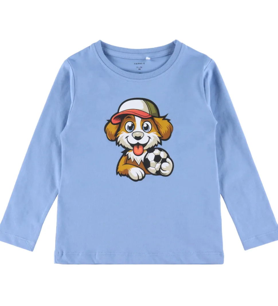 - Lyseblå med et print af en hund med kasket og fodbold foran