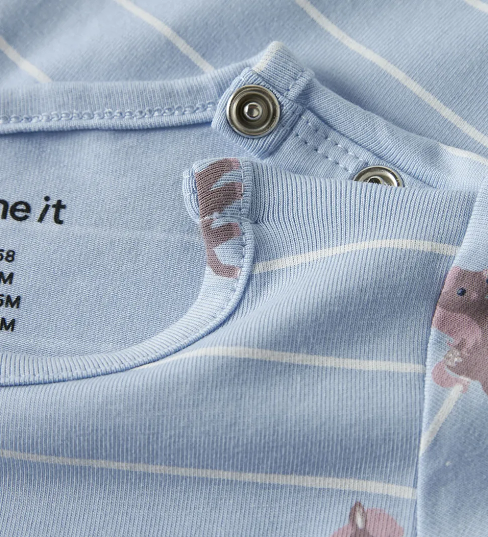 Bodyens struktur er glat, og pasformen er klassisk med praktiske kanter ved ærmerne og i bunden. Name It bodyen lukkes nemt med trykknapper i bunden og ved venstre skulder.