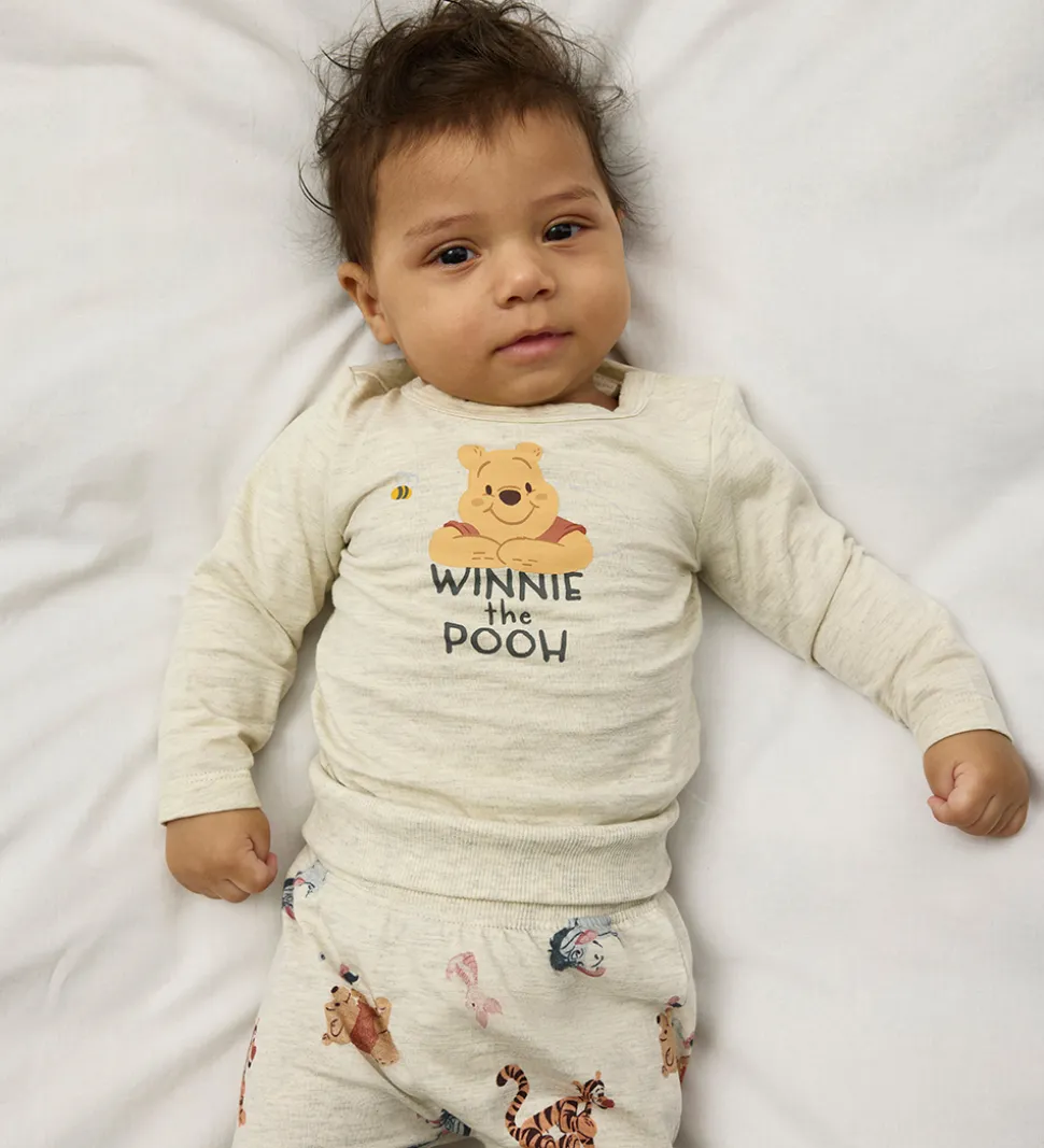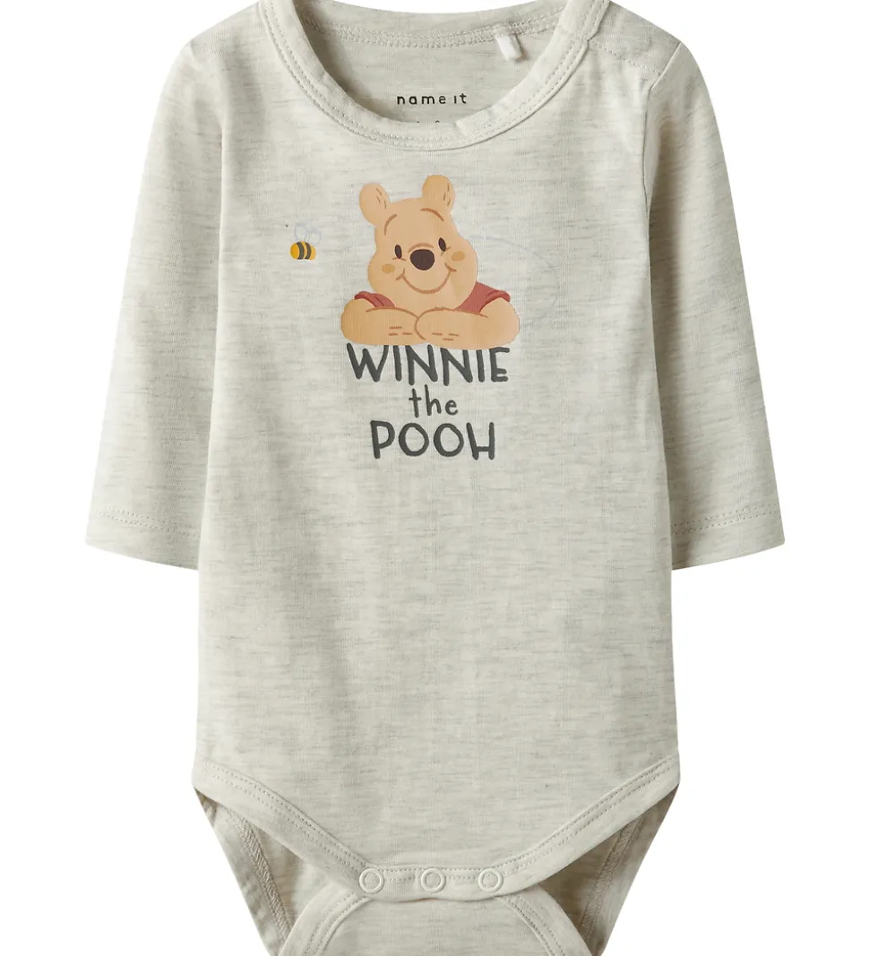 Sød Name It body med lange ærmer i meleret lysegrå. Bodyen har et charmerende print af Peter Plys på fronten med teksten “Winnie the Pooh”. Name It bodyen har en rund halsudskæring med trykknapper ved venstre skulder. Den lukkes med praktiske trykknapper mellem benene.