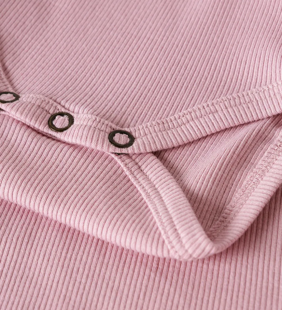 Flot Name It body i rosa med ribstruktur. Bodyen har fin blondekant i halsen og lange ærmer. Den lukkes mellem benene med trykknapper.