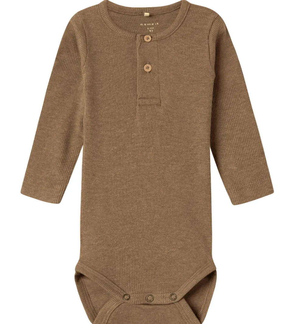 Flot Name It body i brun med ribstruktur. Bodyen har to knapper foran og lange ærmer. Den lukkes med trykknapper mellem benene.
