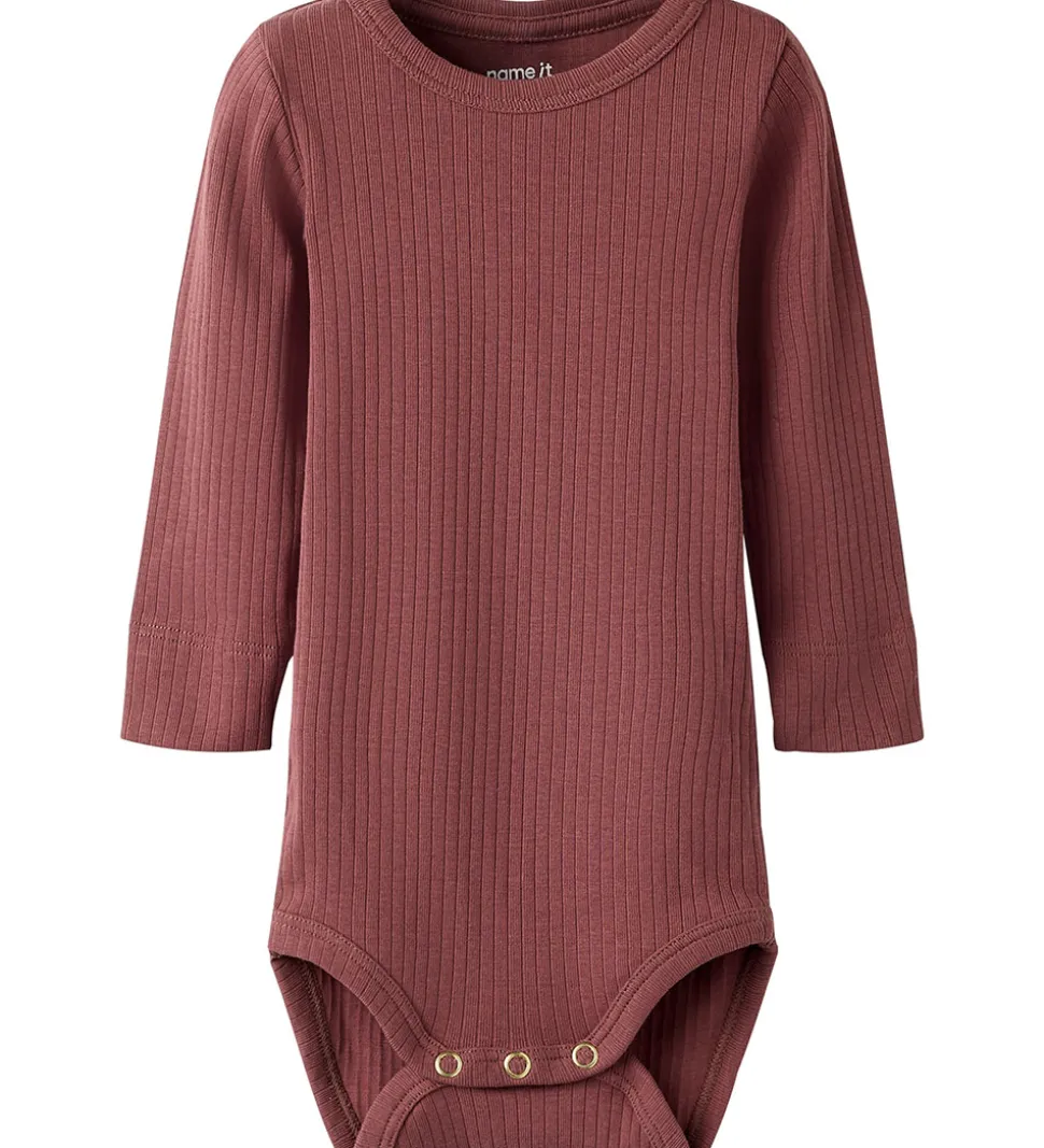 Fin Name It body i en varm, mørk rosa nuance med ribstruktur. Bodyen har en rund halsudskæring med en trykknap ved venstre skulder og lange ærmer. Den lukkes med trykknapper mellem benene.