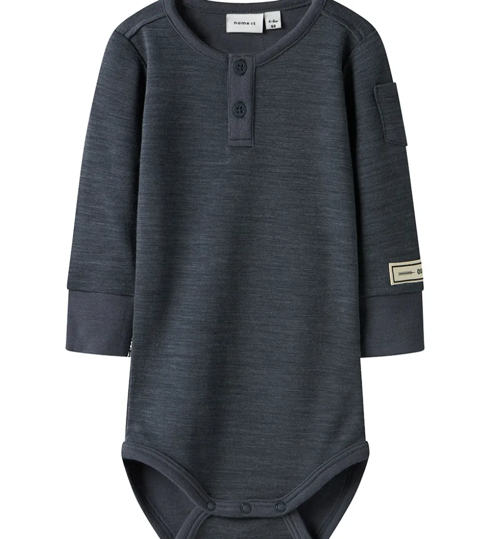 Praktisk Name It body i meleret mørkeblå med en lille, hvid applikation på venstre ærme. Bodyen har en rund halsudskæring med trykknapper foran, og lange ærmer med en lomme øverst på venstre ærme. Den har brede ribkanter ved håndleddene, og lukkes mellem benene med trykknapper. Bodyen er fremstillet i en blød blanding af merinould og viskose.