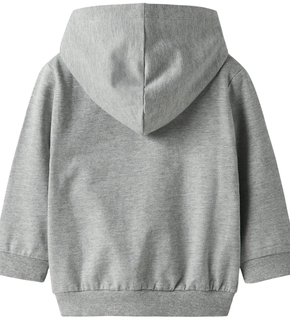 Stilfuld Name It cardigan i gråmeleret sweat, og fortil i venstre side er der trykt en lille dinosaur i støvet grøn. Cardiganen har en fast hætte med et bomuldsfor, og den åbnes med en lynlås. Cardiganen har bløderibkanter, og fortil sidder der to praktiske lommer.