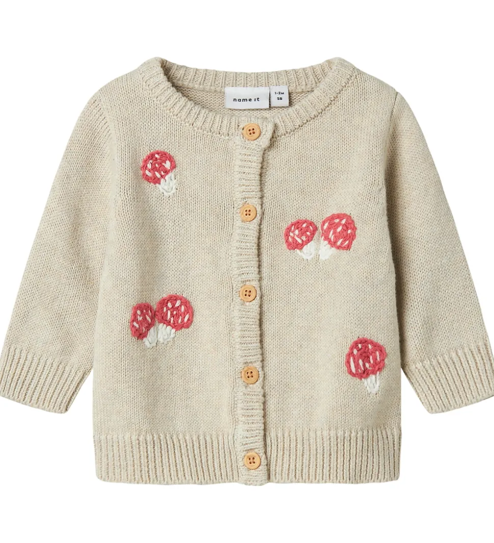 Charmerende Name It cardigan i en blød, beige nuance med et fint svampemotiv i rød og hvid.