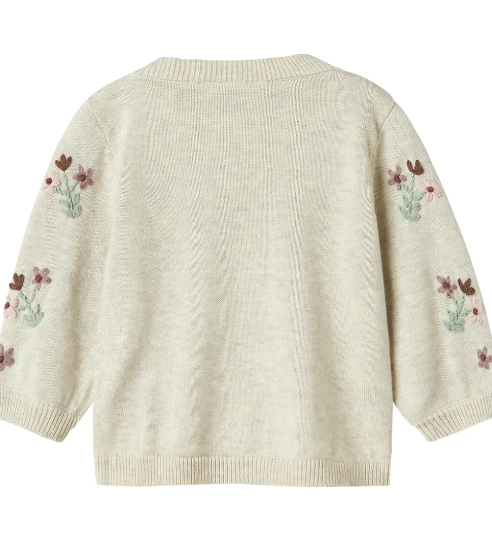 Smuk Name It cardigan i en lys beige nuance og i en strikket kvalitet. Cardiganen har lange ærmer med delikate blomstermotiver broderet på. Denne Name It cardigan er udstyret med en rund halsudskæring. Den har ribkanter ved hals, ærmer og bund, samt knaplukning foran med fine træknapper. Pasformen er afslappet og komfortabel, hvilket gør den velegnet til mange forskellige anledninger.