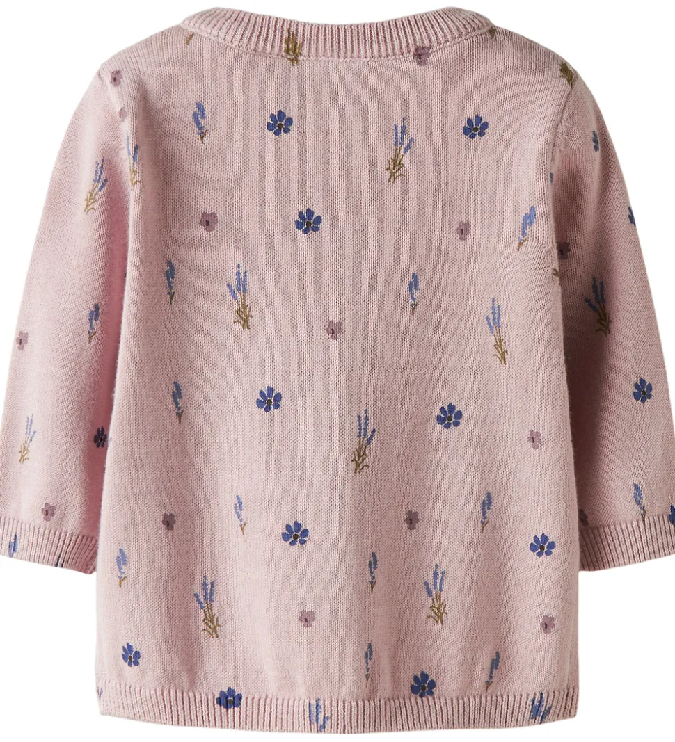 Sød Name It cardigan i rosa strik med print af fine blomster i blå, lilla og grønne nuancer. Cardiganen har en klassisk rund halsudskæring og lukkes med lyse knapper foran. Name It cardiganen har lange ærmer og ribkanter ved alle åbninger.