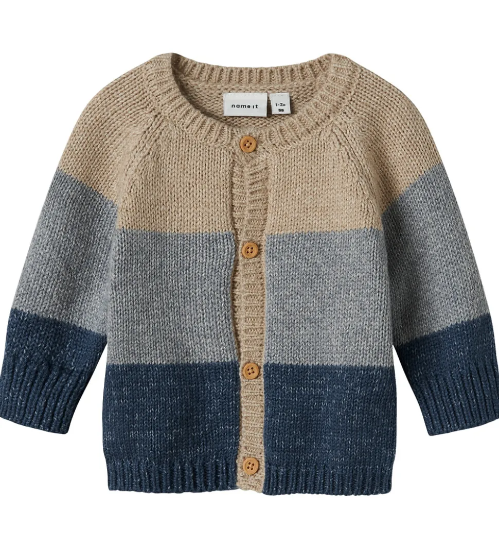Stilfuld Name It cardigan med brede, vandrette striber i beige og blå nuancer.