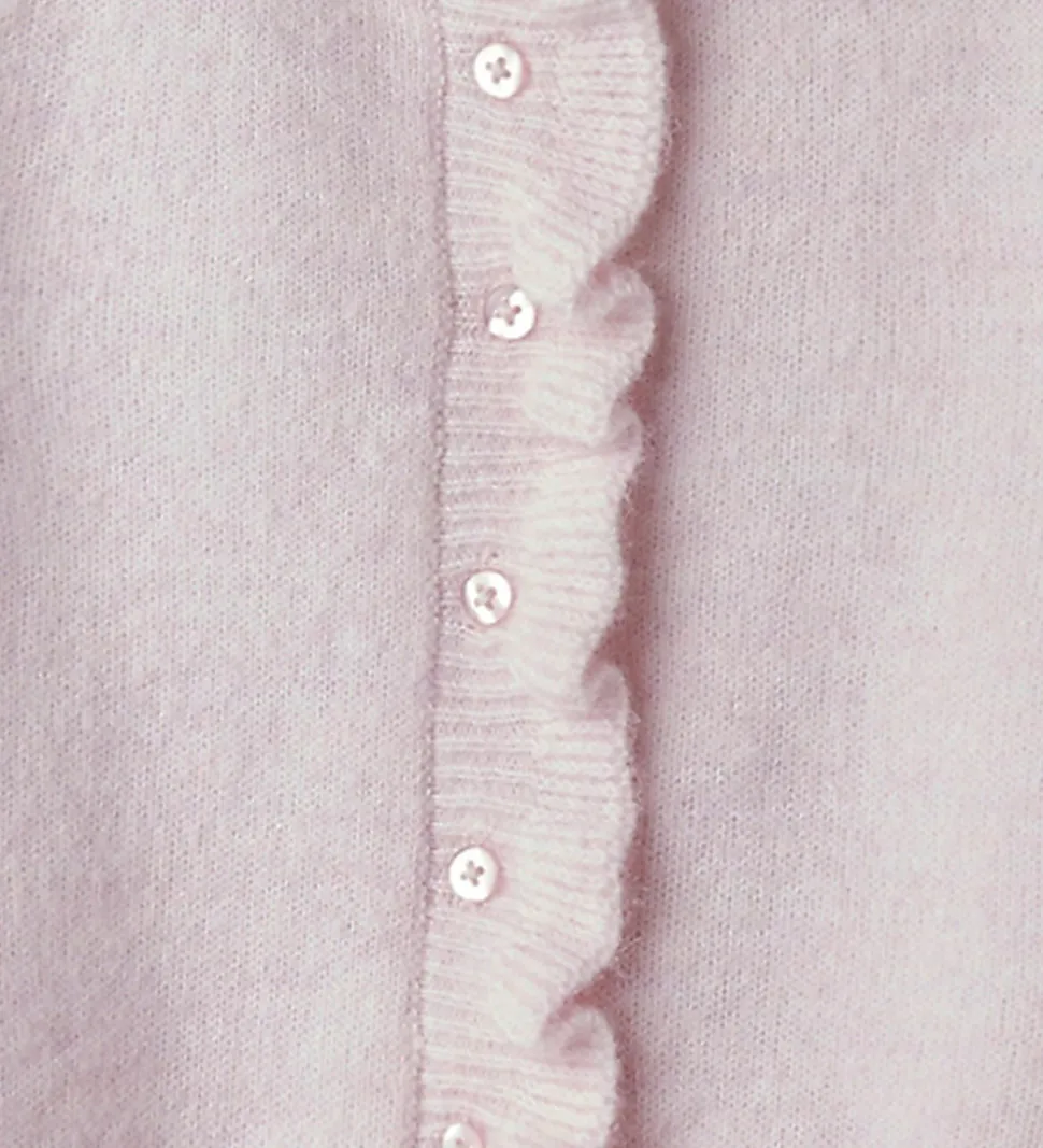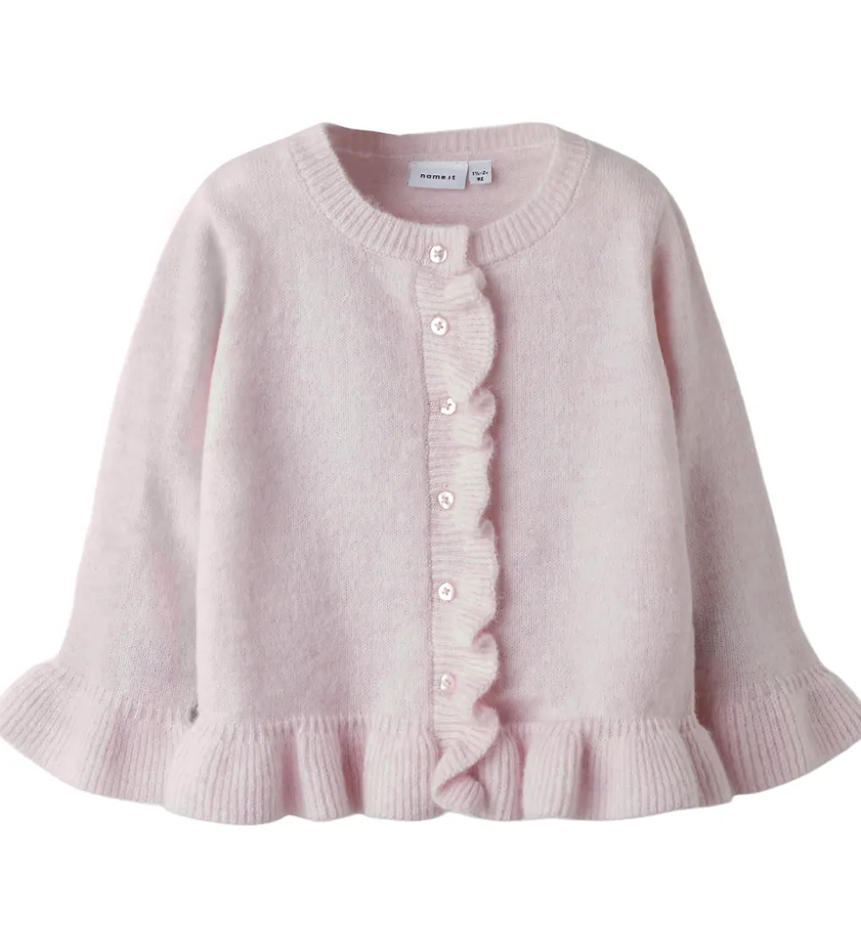 Fortryllende Name It cardigan i en lyserosa nuance med elegante flæsedetaljer langs knaplukningen. Cardiganen har en rund halsudskæring og lange ærmer, der afsluttes med en bred kant. Den bløde struktur gør Name It cardiganen til et behageligt valg til garderoben.