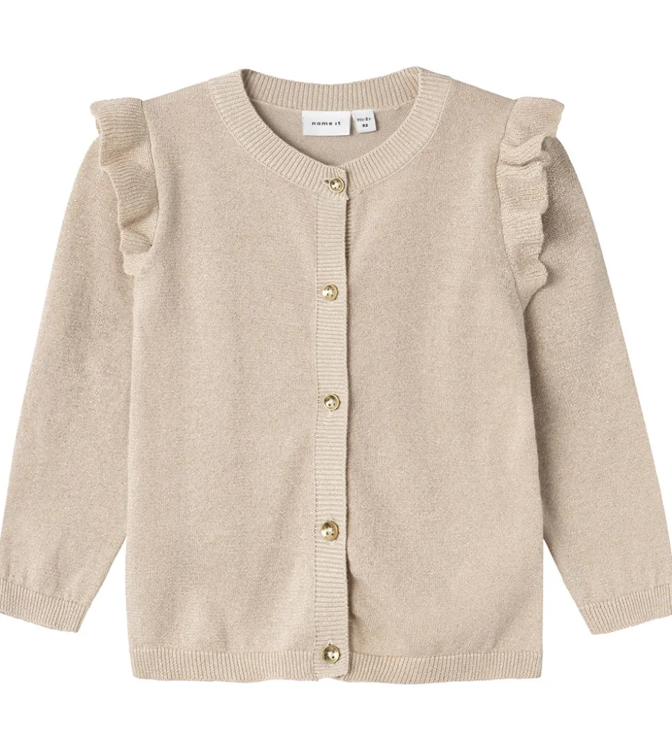 Lækker Name It cardigan i beige strik, med en flot guldfarvet glimmereffekt.