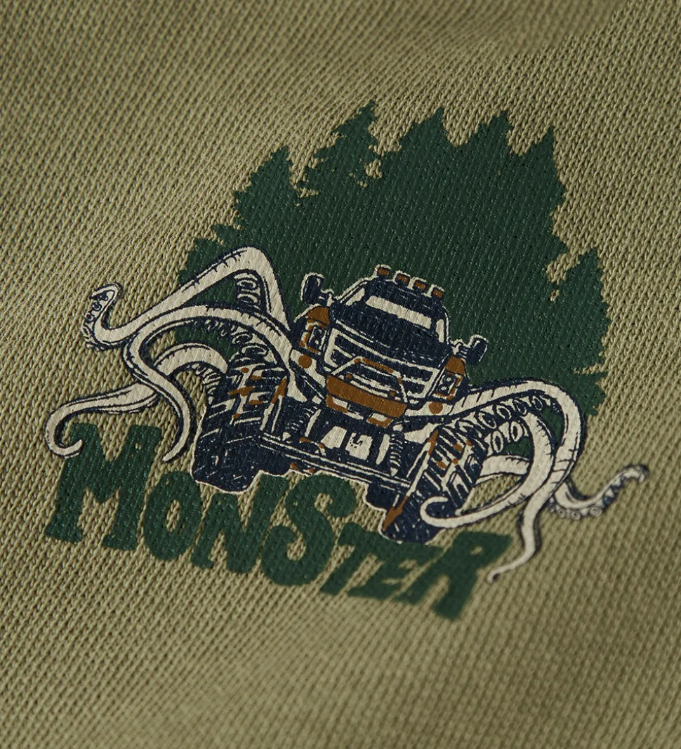 Stilfuld Name It cardigan i olivengrøn med et lille print på venstre bryst af en monstertruck og teksten “Monster”. Cardiganen er i en lækker sweatkvalitet med en fastsyet hætte, lange ærmer og gennemgående lynlås fortil. Den har ribkanter i alle åbninger, og indvendigt er der blødt, børstet bomuld.