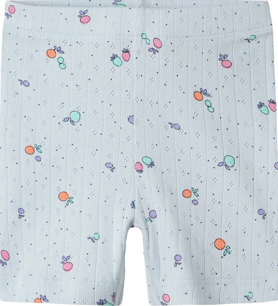 Charmerende Name It cykelshorts i lyseblå med et farverigt print af små frugtmotiver og et flot hulmønster. Name It cykelshortsene har en behagelig pasform og et sødt design, der bringer et strejf af leg til hverdagen.