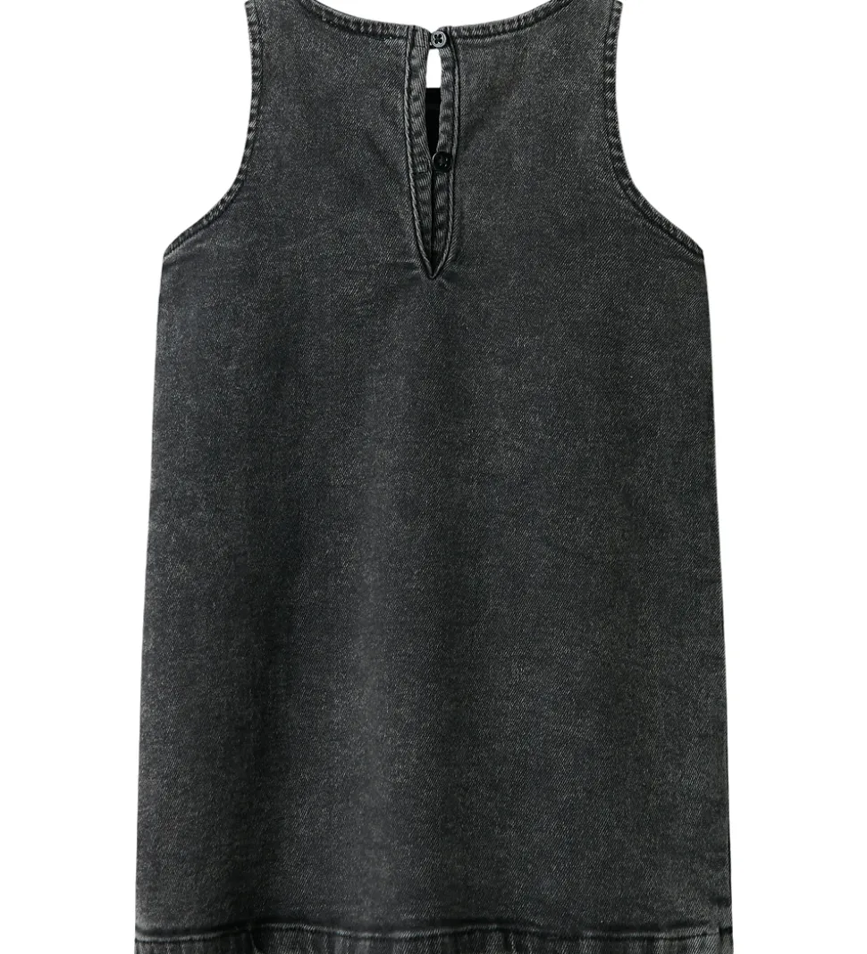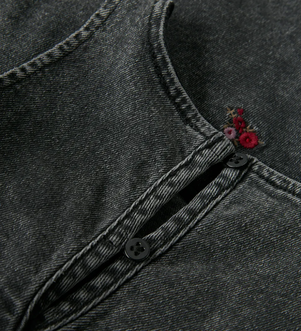 Elegant Name It denimkjole i mørkegrå med vasket look og små, broderede blomster i mørkerød og lilla. Denimkjolen har brede skulderstropper, og en rund halsudskæring. Kjolen lukkes med knapper i nakken. Den har et lige snit, og egner sig til både hverdag og festlige lejligheder.