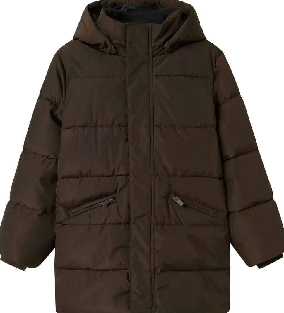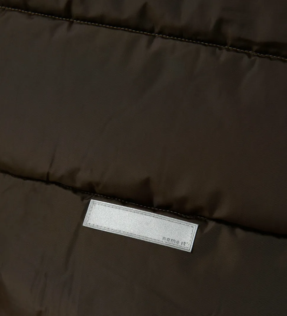 Flot Name It dynefrakke i ensfarvet mørkebrun og med vandrette syninger samt praktiske reflekser.