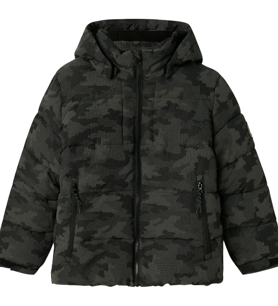 Flot Name It dynejakke i sort med et camouflagemønster som refleksprint. Dynejakkens struktur er både stilfuld og funktionel med et quiltet design, der giver et puffy look.