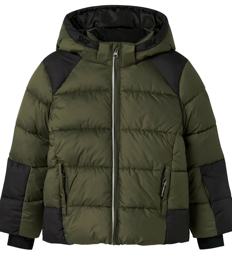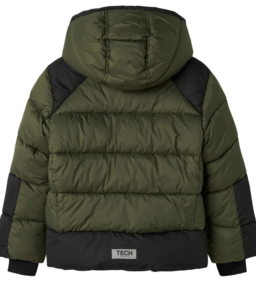 Lækker Name It dynejakke i mørkegrøn med vandrette syninger og enkelte sorte paneler. Dynejakken har velplacerede refleksdetaljer.