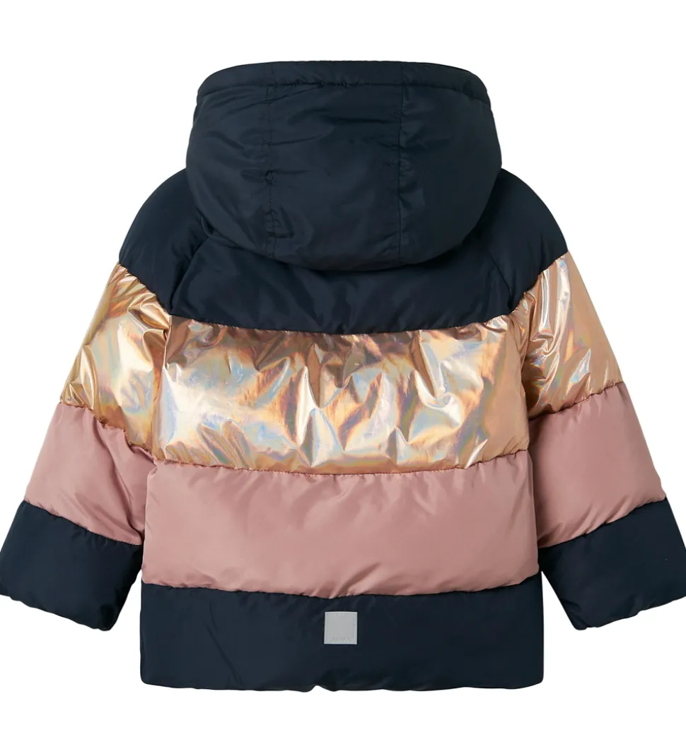 Lækker Name It dynejakke med brede striber i navyblå, rosa og skinnende guld. Dynejakken er med vandrette syninger.