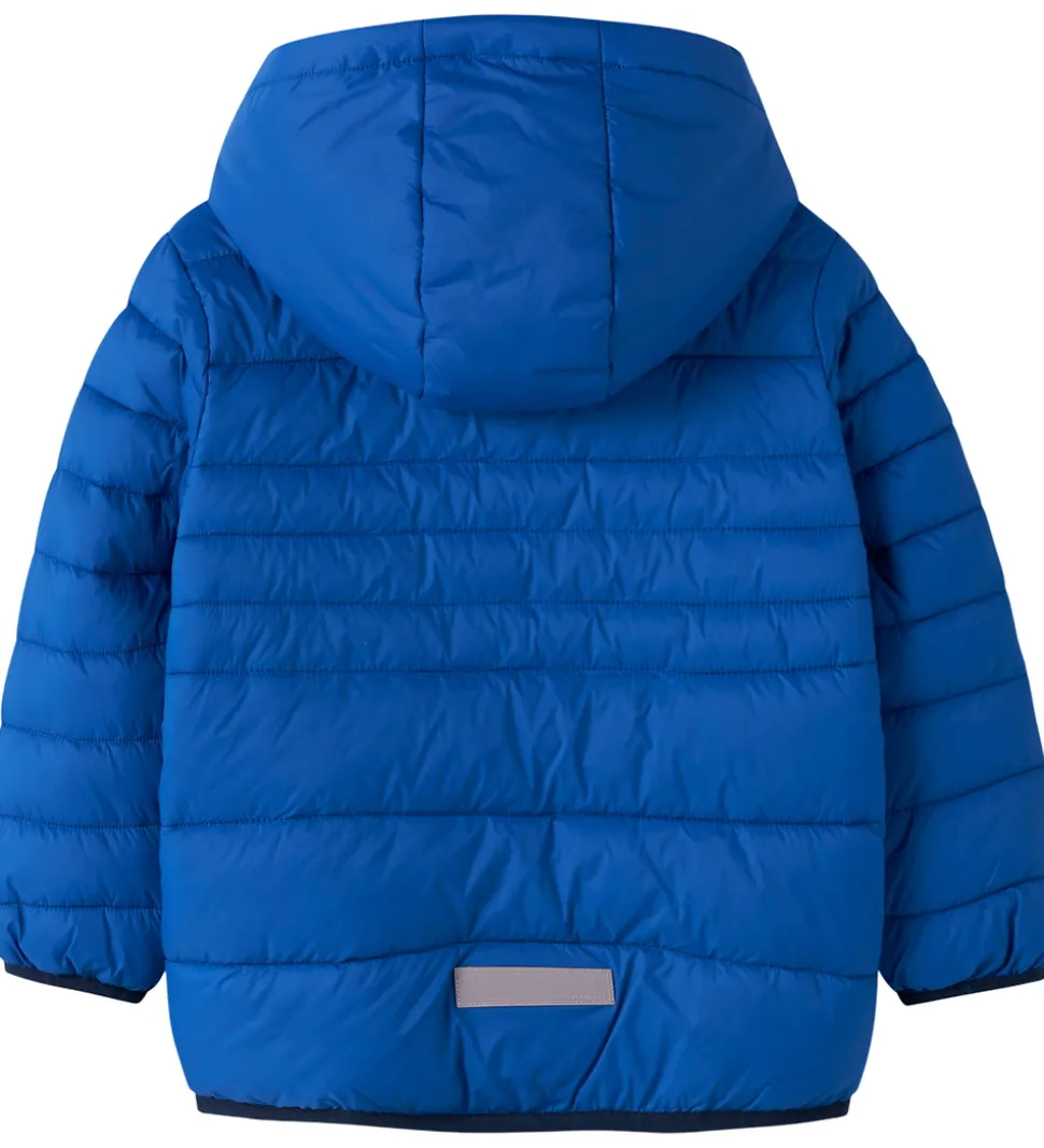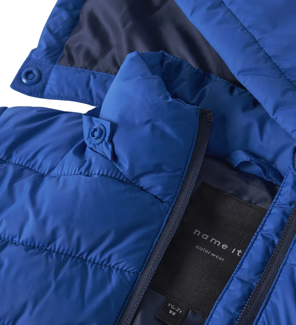 Smart Name It dynejakke i en flot kongeblå nuance. Dynejakkens design er kendetegnet ved vandrette syninger, der skaber en struktureret effekt. Foran findes et lille, diskret mærke med tekst.