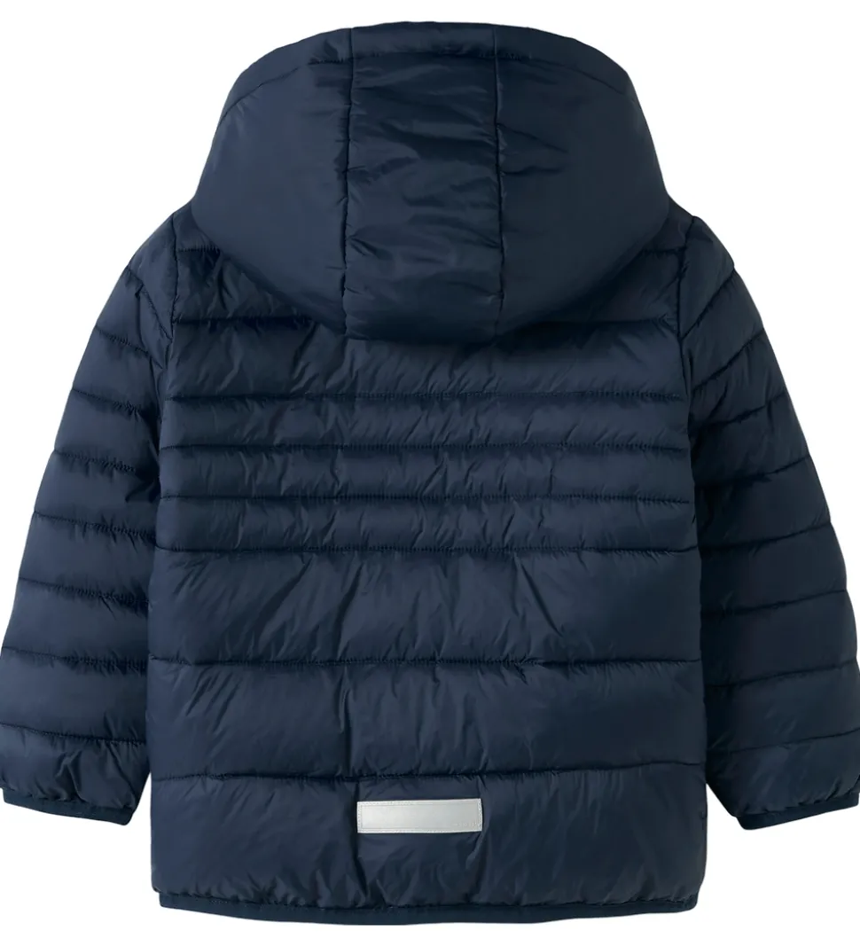 Stilfuld Name It dynejakke i dyb navy med et diskret firkantet logo på venstre bryst. Dynejakken har vandrette syninger, der skaber en ensartet overflade.