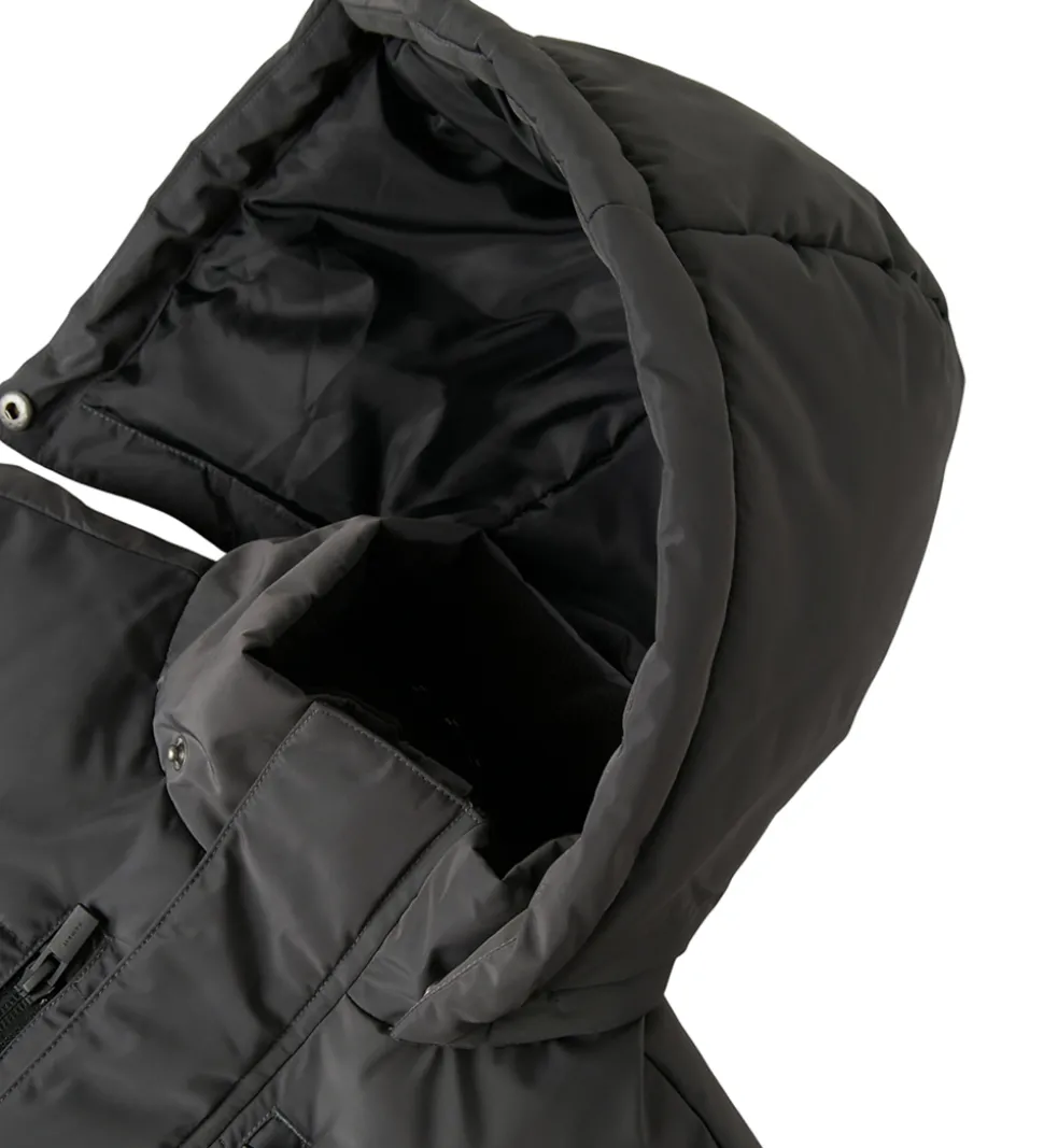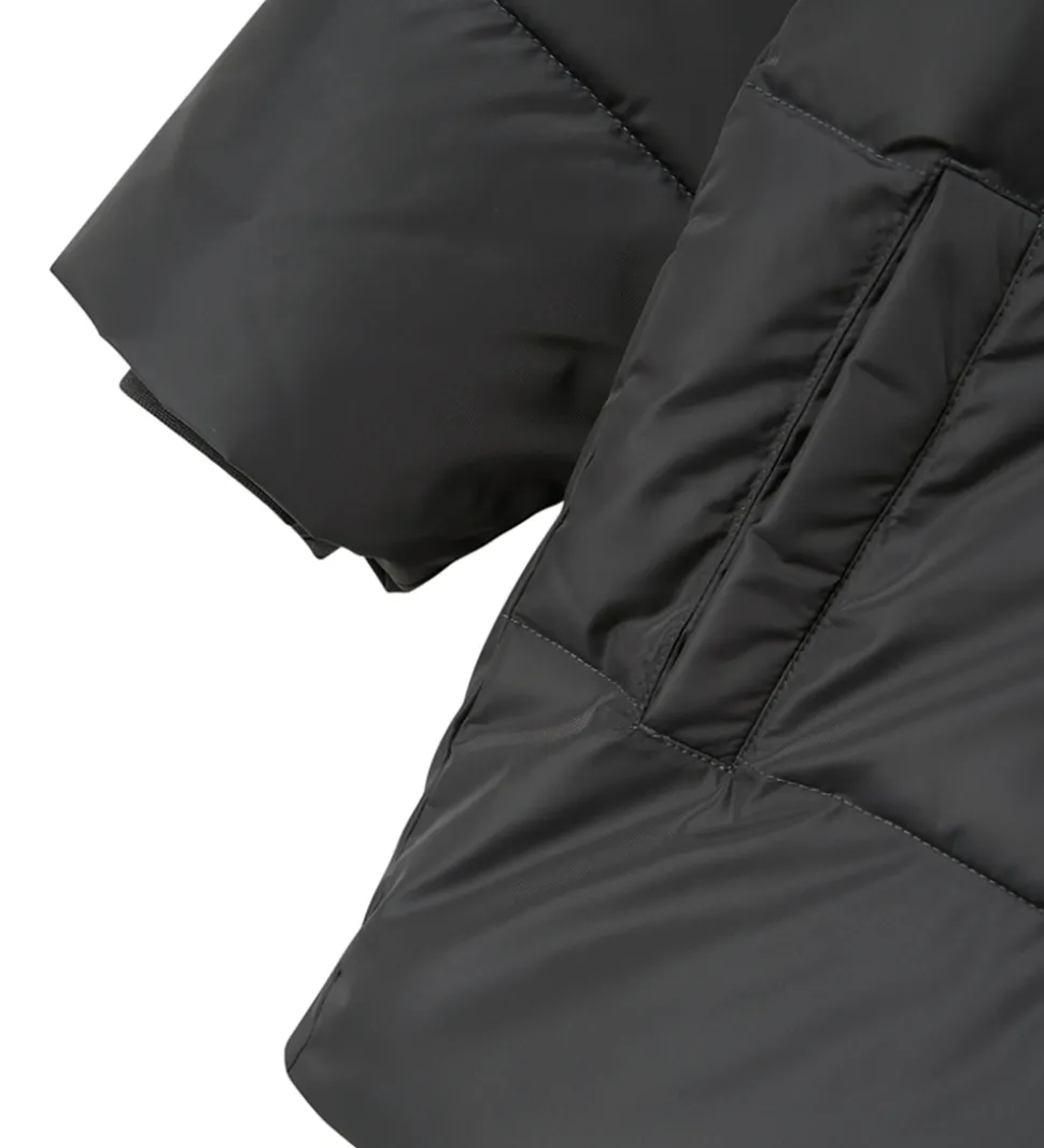 Flot Name It dynejakke i mørkegrå med vandrette syninger. Dynejakken har en praktisk refleks nederst på ryggen.