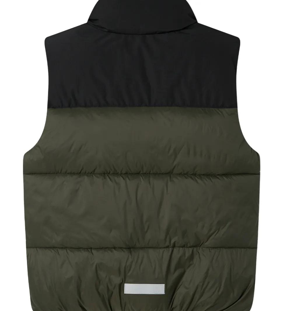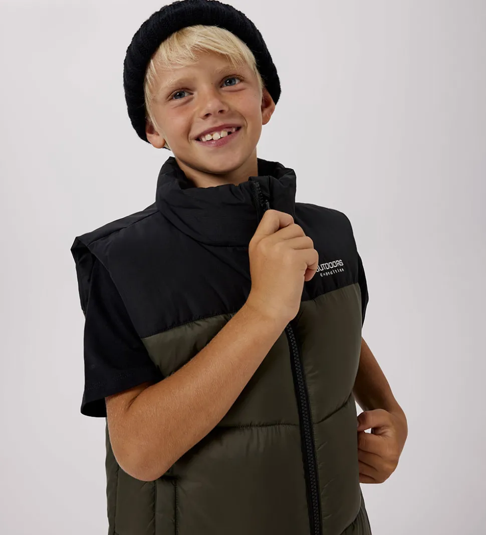 Lækker Name It dynevest i en flot kombination af sort og olivengrøn med et hvidt “OUTDOORS expedition” logo på brystet.