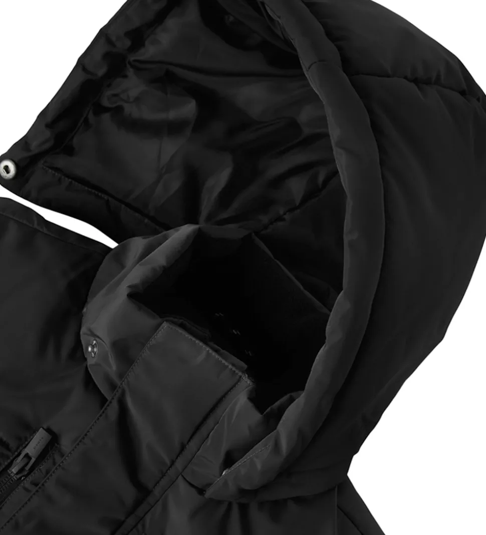 Name It dynejakke har en aftagelig hætte og en mellemhøj krave med blødt fleece indvendigt. Den lukkes fortil med en gennemgående lynlås med hagebeskytter og dobbelt vindstolpe, hvoraf den yderste vindstolpe lukkes til med velcro. Dynejakken har snefang i ærmerne med brede ribkanter. Den har to lynlåslommer ved brystet og i siderne er der to lommer, som lukkes med trykknapper.