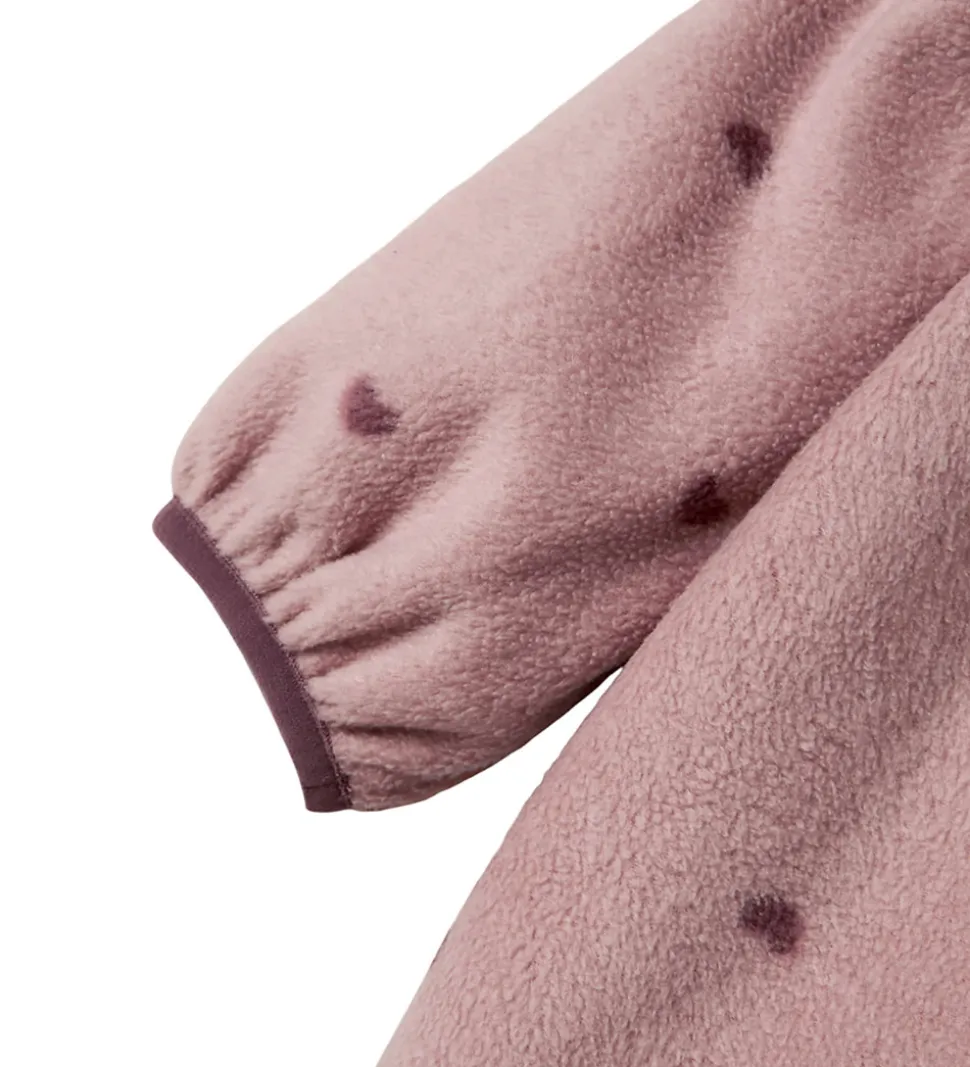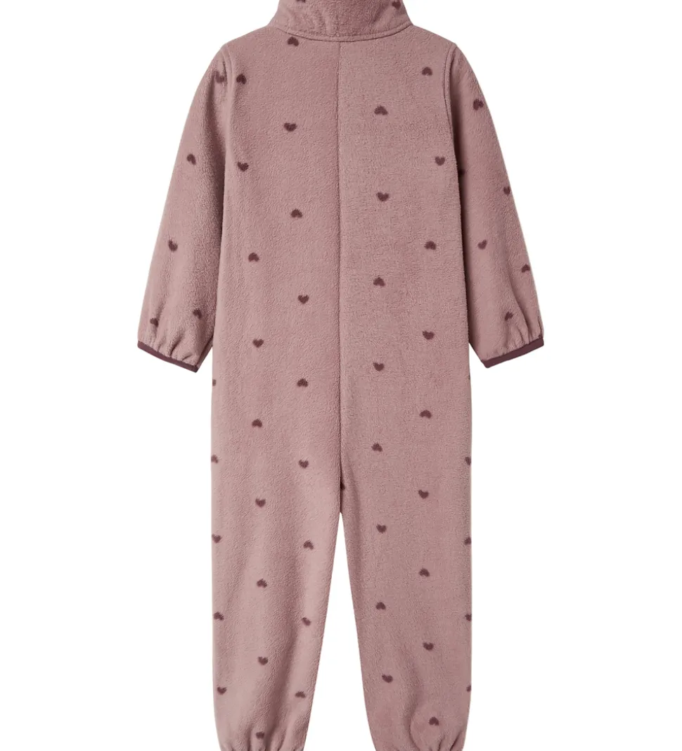 Blød Name It fleecedragt i en varm rosa nuance med små mørkelilla hjerter.