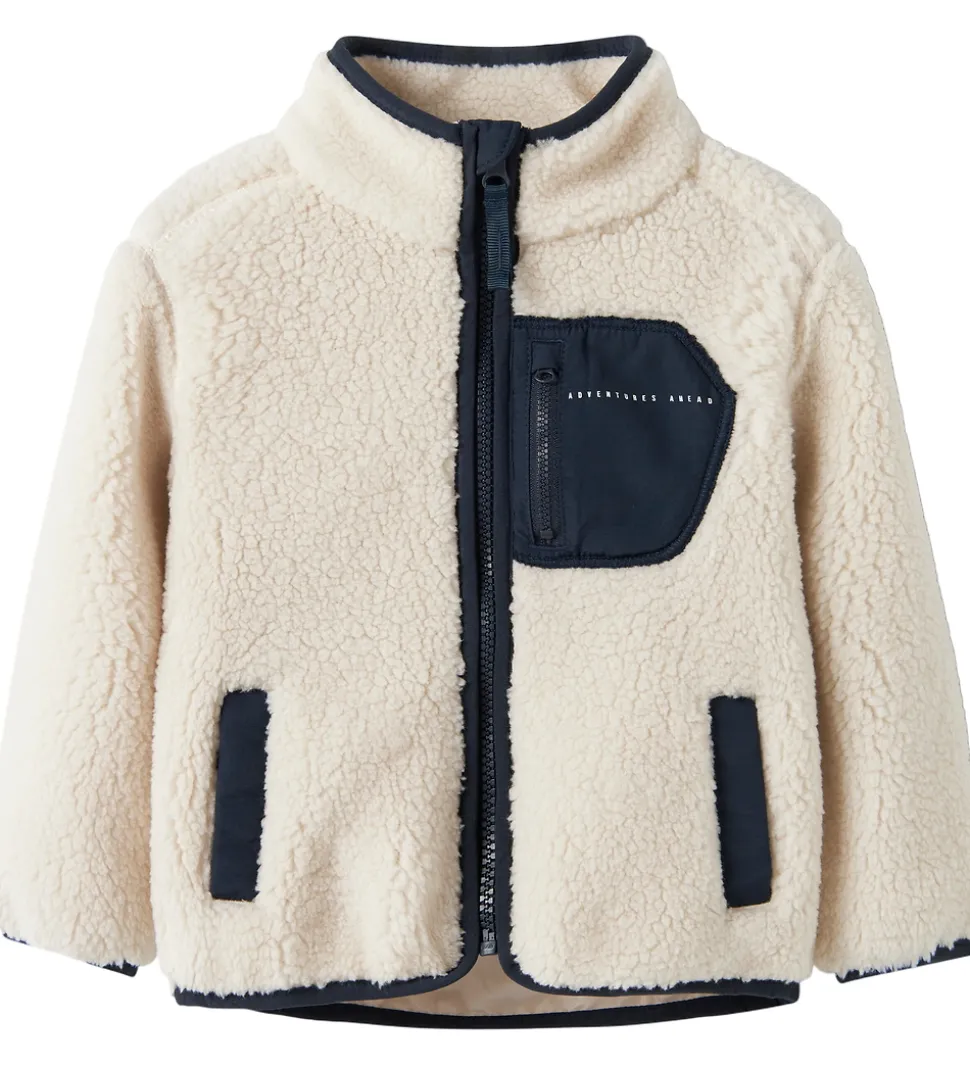 Charmerende Name It fleecejakke i en blød cremefarve med kontrastdetaljer i mørkeblå. Fleecejakken har en høj hals og lange ærmer. Fronten har en gennemgående lynlås, der giver nem adgang. Name It fleecejakken er udstyret med en lille praktisk brystlomme og to frontlommer, der tilføjer funktionalitet og stil.