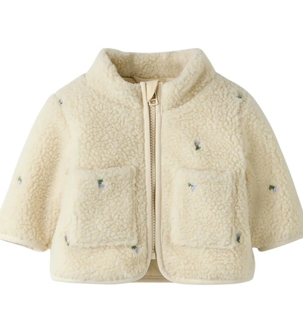 Delikat Name It fleecejakke af teddyfleece i en lys cremefarve med små blomsterdetaljer. To praktiske forlommer pynter foran og giver ekstra mulighed for opbevaring.