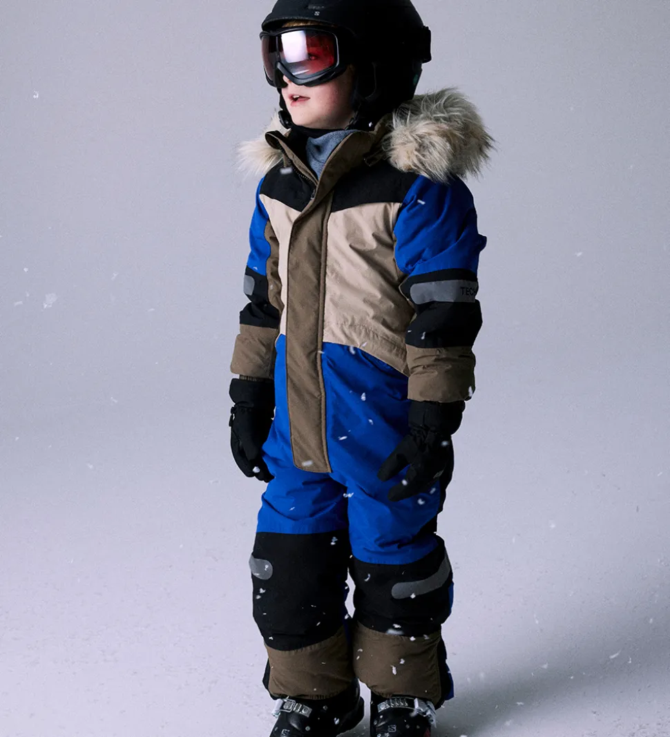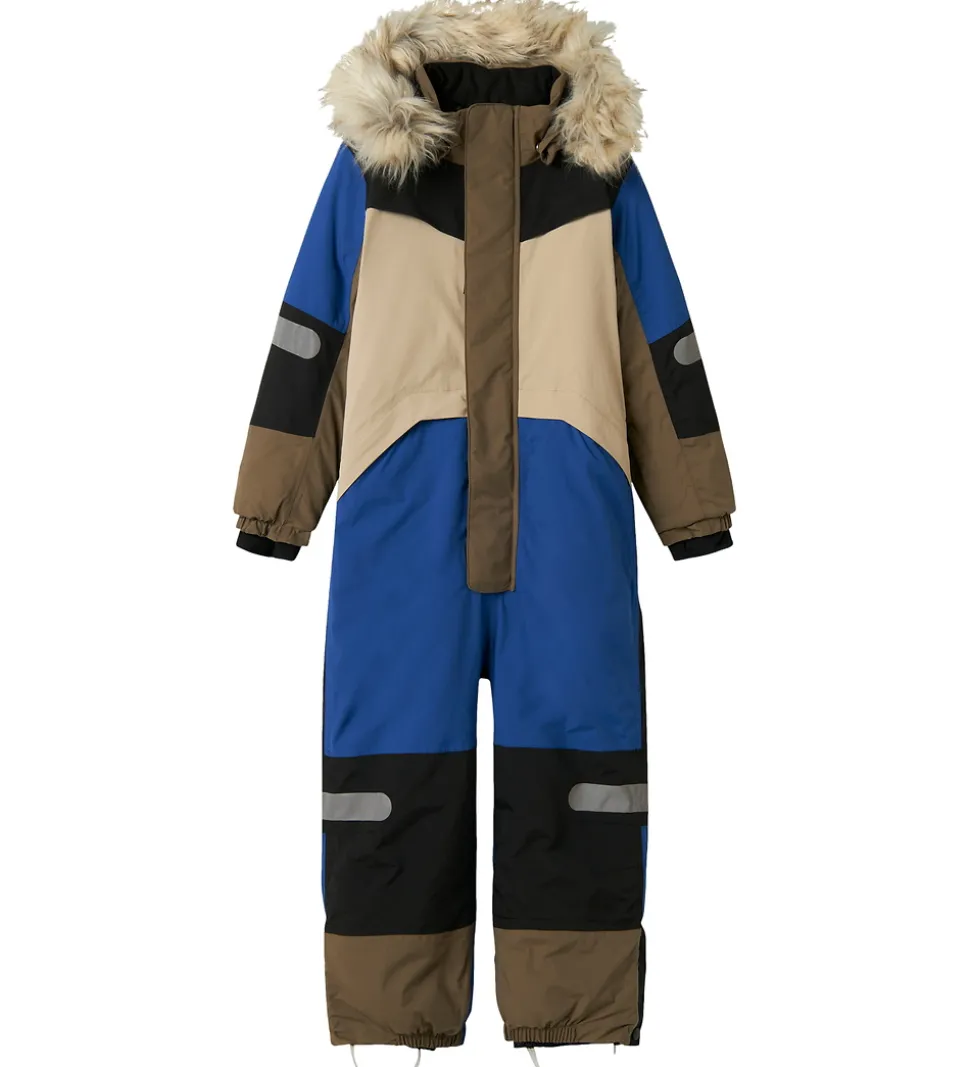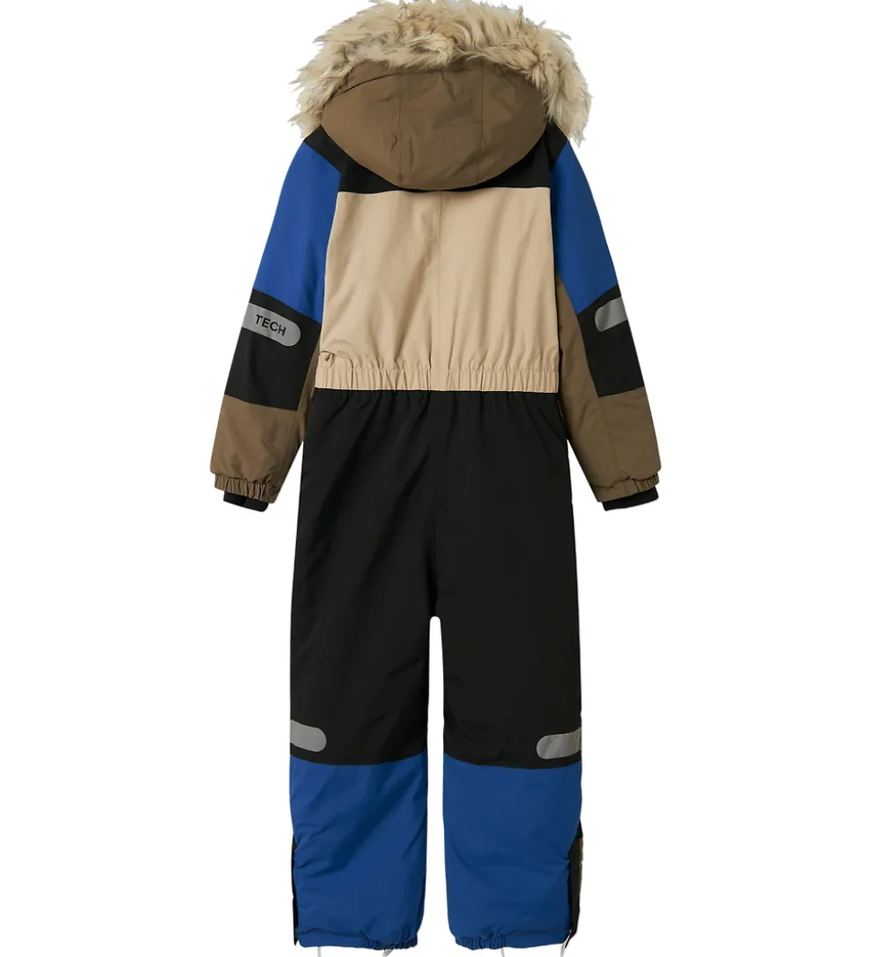 Flot Name It flyverdragt i blå, sort, og to brune nuancer.
