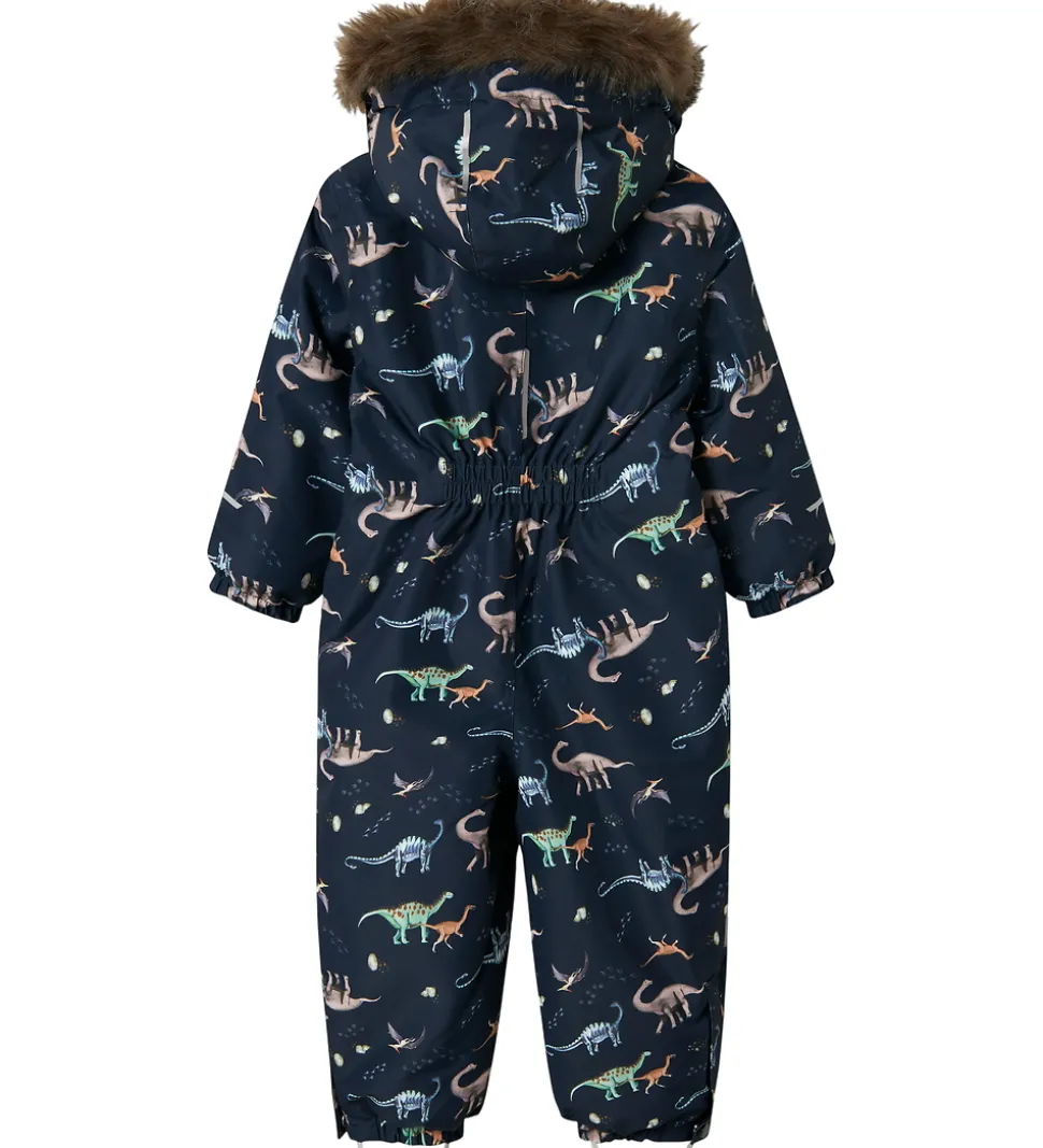 Fed Name It flyverdragt i navyblå med et farverigt alloverprint af dinosaurer.