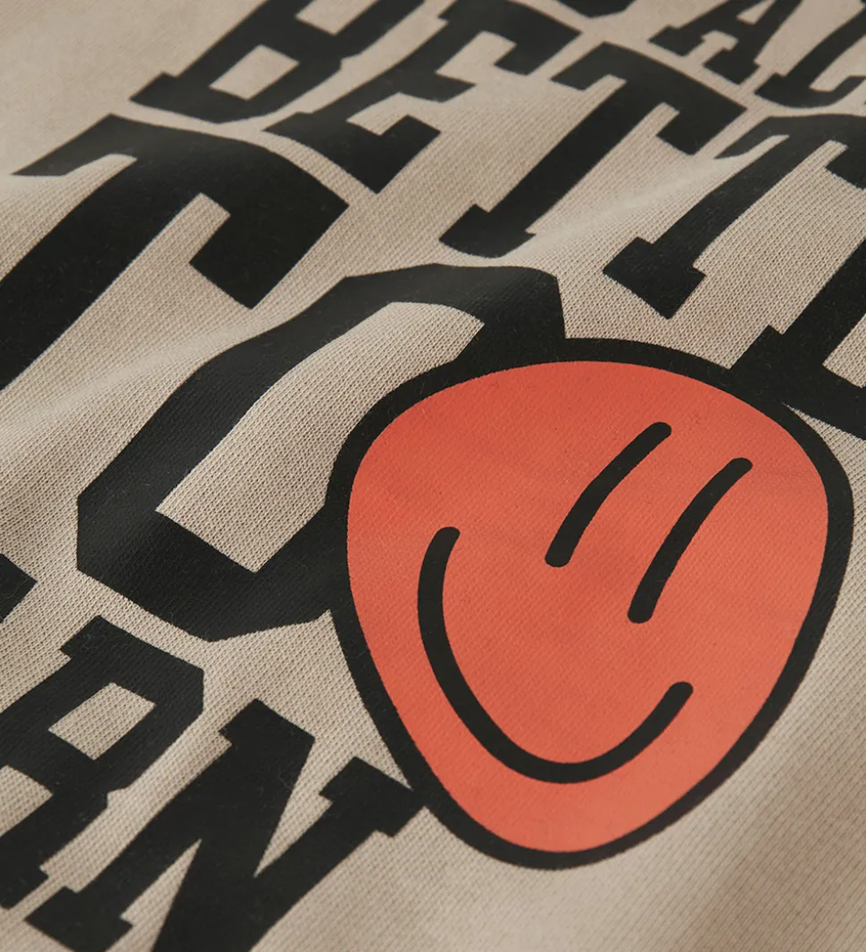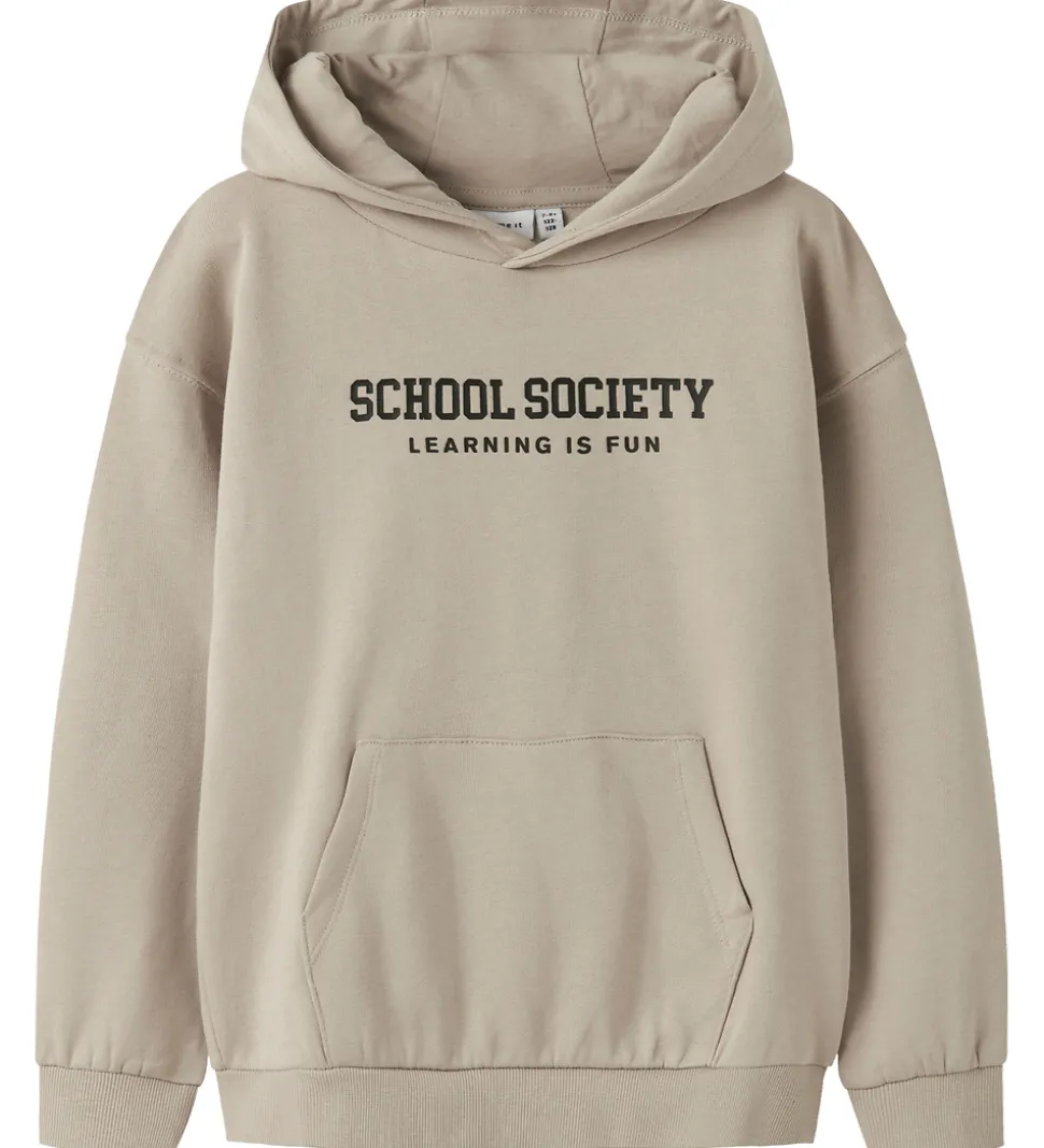 Stilren hættetrøje fra Name It i en lys beige. Hættetrøjen prydes af et iøjefaldende print på brystet med teksten “Society School” i sort. Name It hættetrøjen har en praktisk kængurulomme på fronten samt ribkanter ved håndleddene og i livet. Indvendigt har hættetrøjen blødt børstet bomuld.