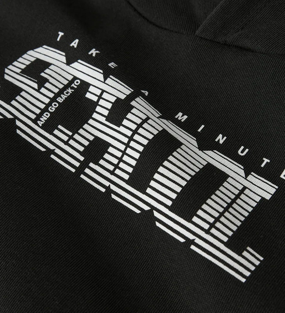 Flot Name It hættetrøje i en klassisk sort farve med hvid tekst på fronten, hvor der står “Take A Minute School”. Hættetrøjen har en rummelig kængurulomme på forsiden. For enden af ærmerne og i taljen findes brede ribkanter, som giver en god pasform. Name It hættetrøjen har blødt børstet bomuld på indersiden.