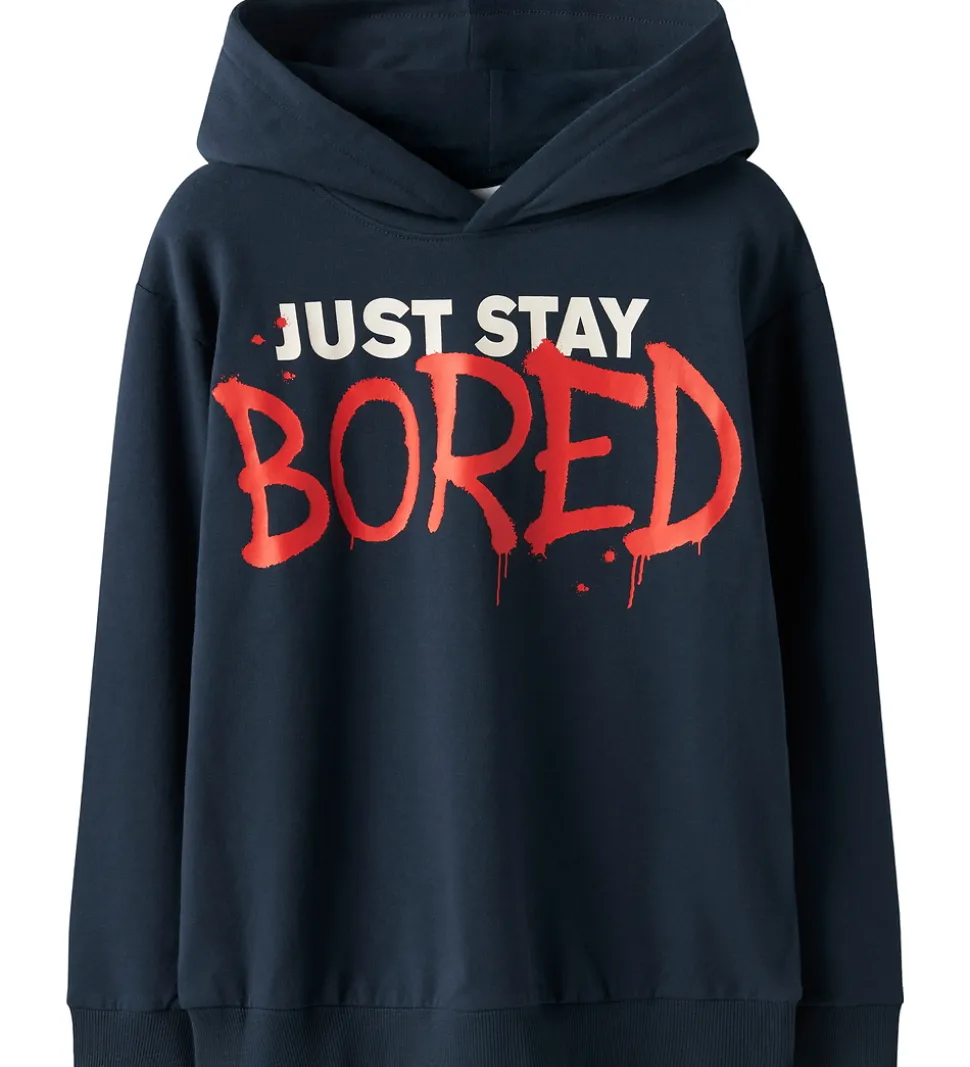 Trendy Name It hættetrøje i en dyb navyblå farve med et iøjnefaldende print på fronten med teksten “Just Stay Bored” i hvide og røde nuancer. På ryggen er der et stort print af farverige spraydåser. Hættetrøjen har en blød hætte og lange ærmer med ribkanter i ærme- og taljeåbning. Indvendigt er der blødt, børstet bomuld