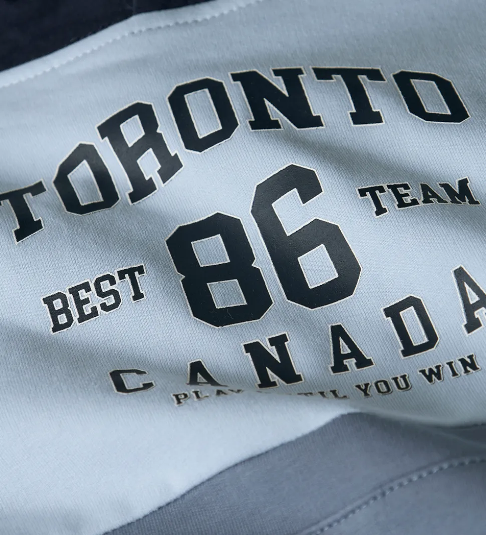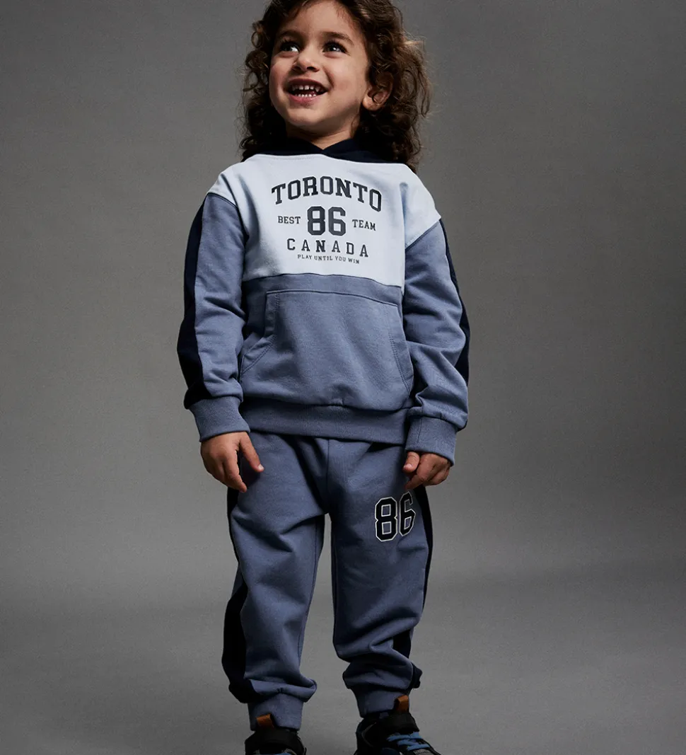 Hættetrøjen har teksten “TORONTO BEST TEAM 86” trykt på fronten i kontrastfarver. En praktisk kængurulomme er placeret foran, og trøjen har ribkanter ved ærmerne, hvilket giver et godt fit. Hættetrøjen fra Name It er designet med en klassisk hætte for ekstra beskyttelse.
