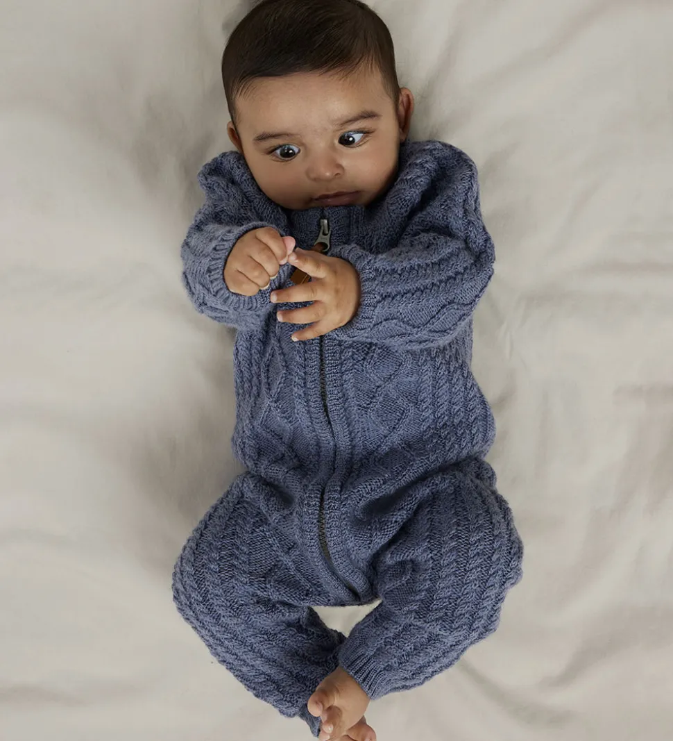 Flot Name It heldragt i en dyb, gråblå nuance med et karakteristisk strikmønster. Dragten har et elegant flettemønster, som giver den et unikt udtryk.