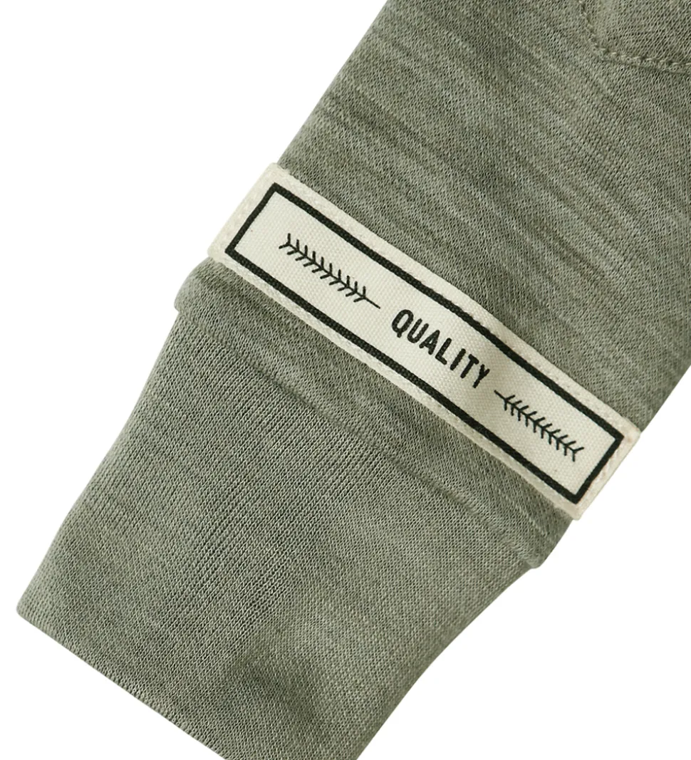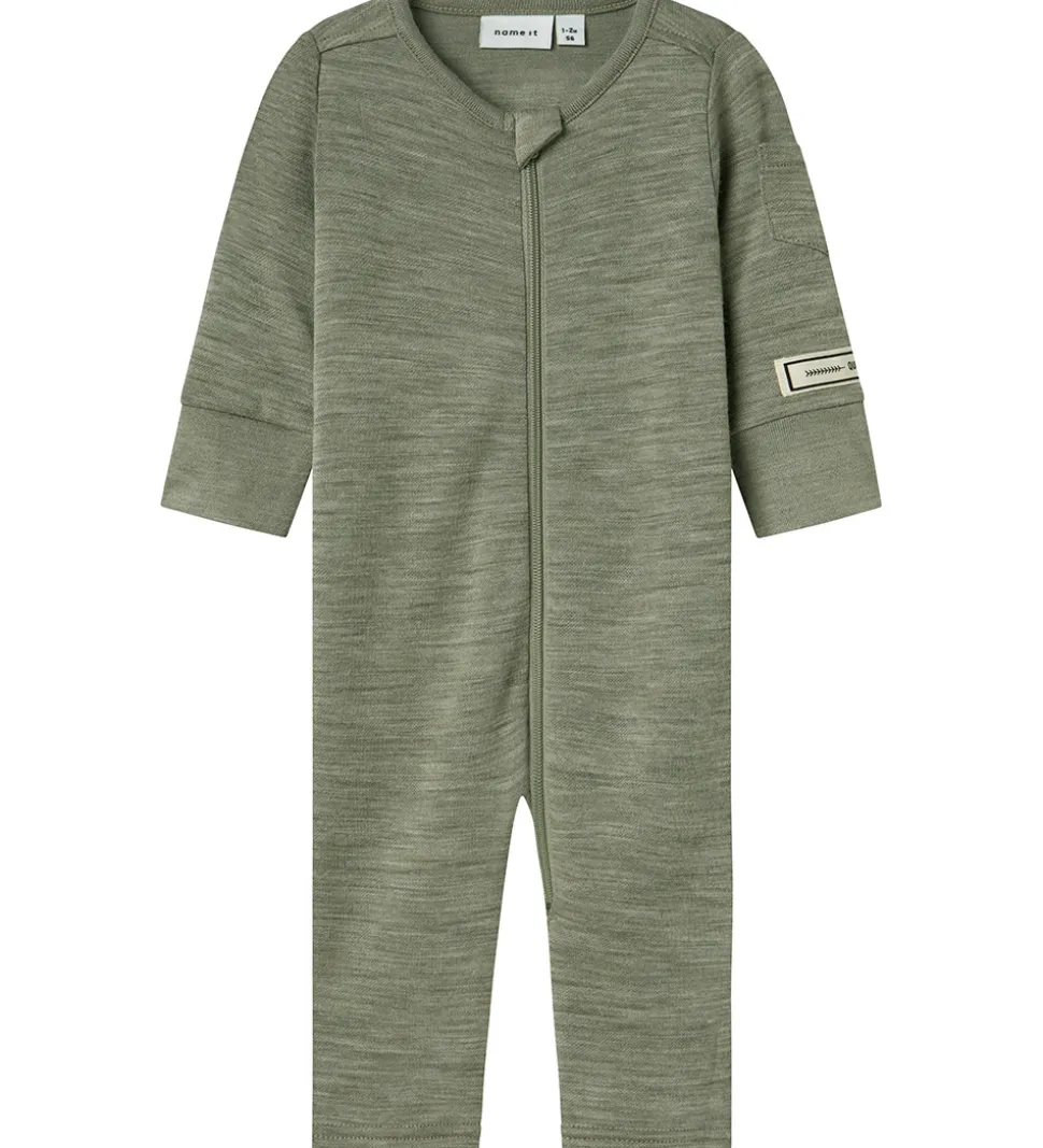Skøn Name It heldragt i meleret grågrøn med en lille, hvid applikation nederst på venstre ærme. Heldragten har en rund halsudskæring, og lukkes foran med en lynlås med hagebeskytter. Den har lange ærmer med brede ribkanter og en lille lomme øverst på venstre ærmer. Heldragten har lange ben med mulighed for ombuk til lukkede fødder.