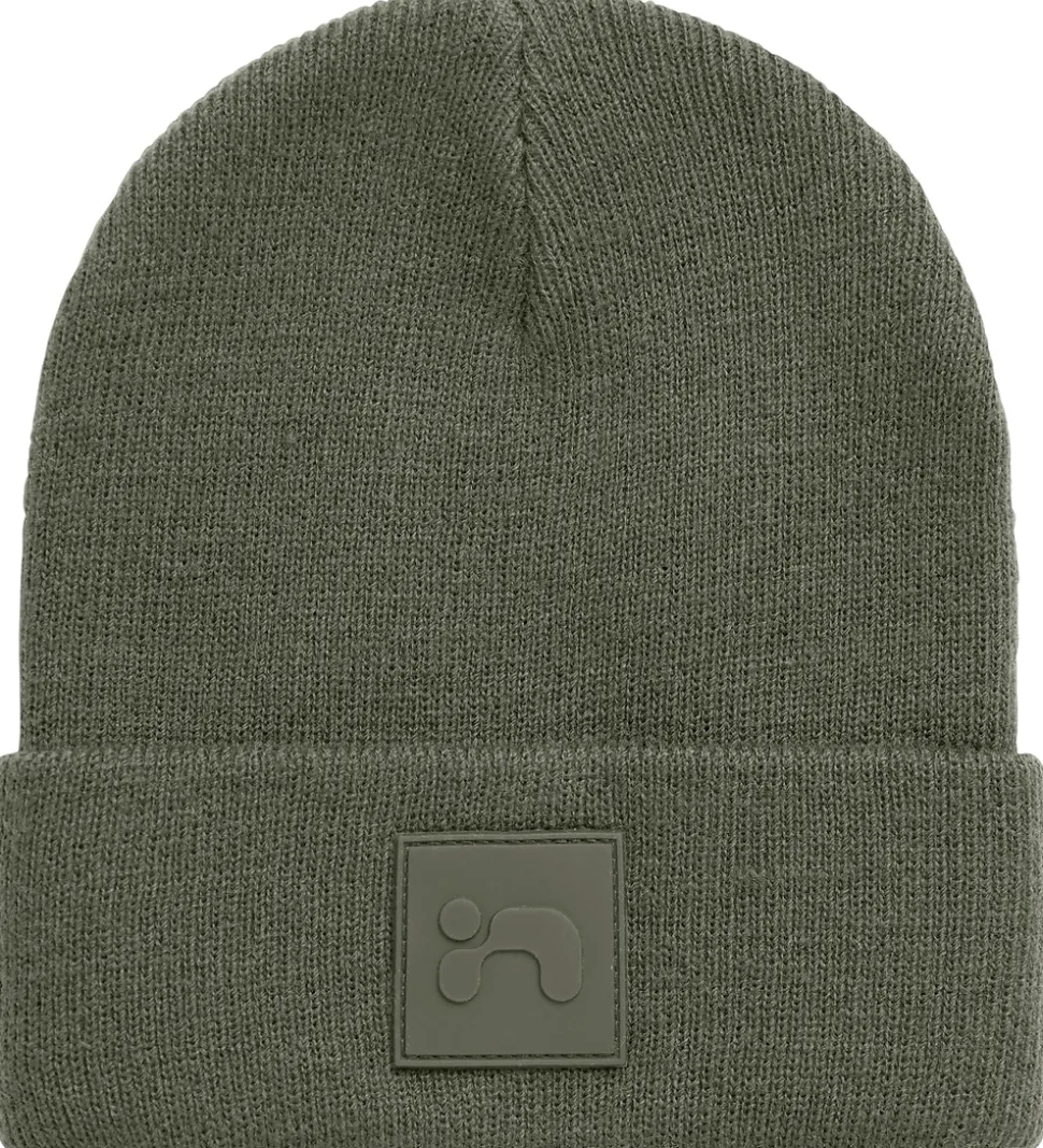 Smart Name It hue i armygrøn med et diskret gummilogo på fronten. Huen har en flot ribstrikket struktur, og en rund hovedform med et bredt ombuk forneden.