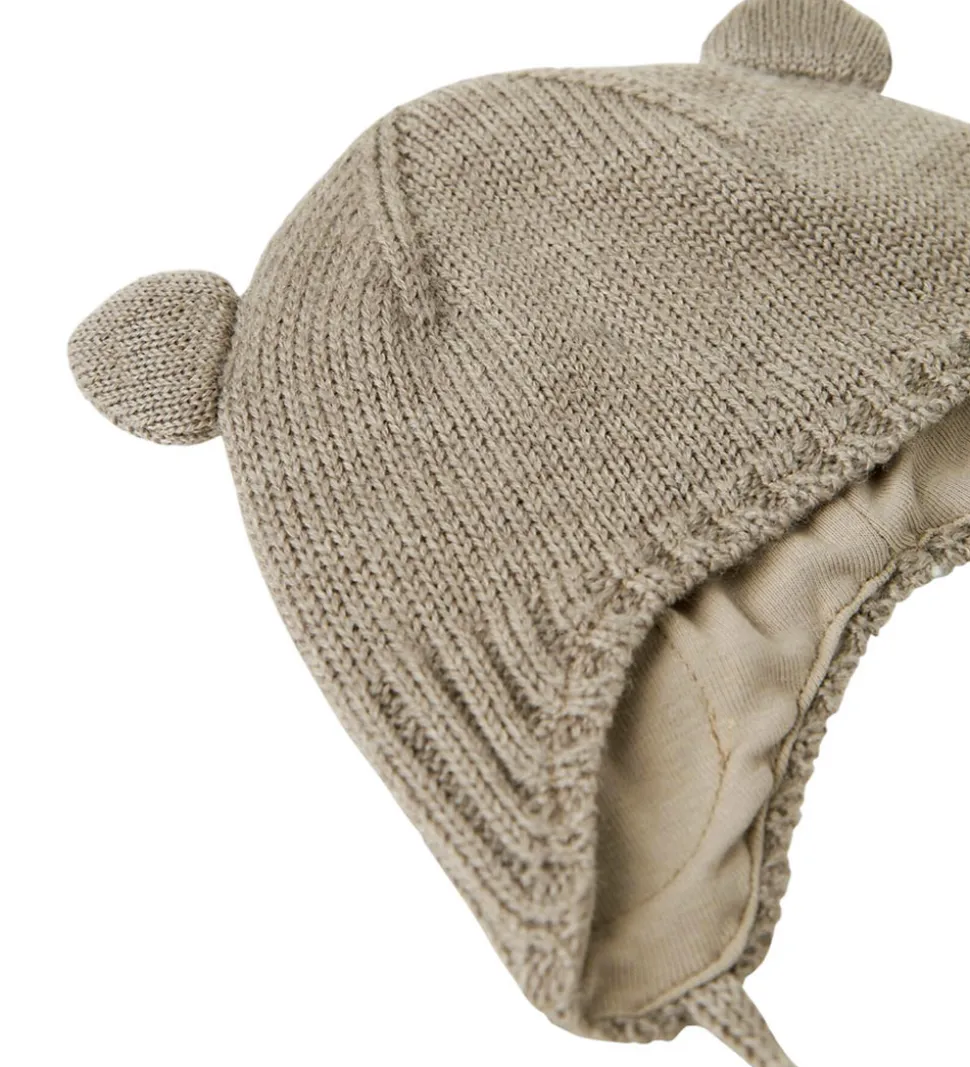Charmerende Name It hue i lysebrun med påsyede ører, der stikker ud fra toppen af huen.
