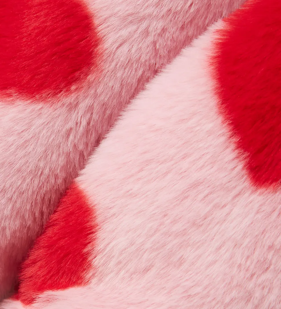 Dejlig Name It jakke af imiteret pels og i en lys rosa farve med røde hjerteprint. Name It jakken har en blød finish og en praktisk lynlåslukning samt åbne lommer i siderne. Perfekt til at holde børn varme i koldere vejr.